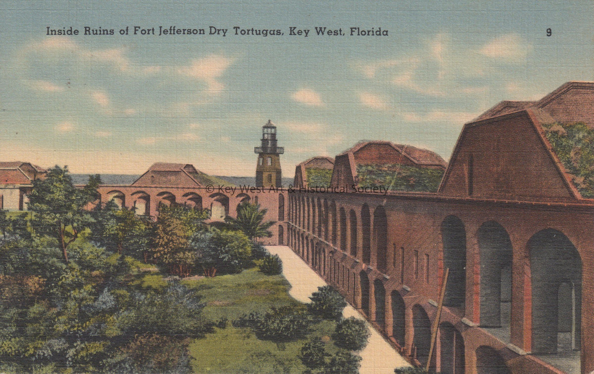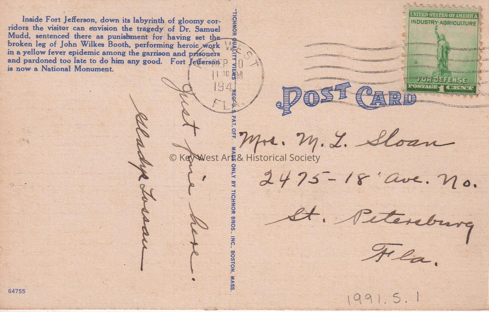 Postcard depicting the interior courtyard and lighthouse at Fort Jefferson. The caption reads, ‘Inside Ruins of Fort Jefferson Dry Tortugas, Key West, Florida’. The description on the verso reads, ‘Inside Fort Jefferson, down its labyrinth of gloomy corridors the visitor can envision the tragedy of Dr. Samuel Mudd, sentenced there as punishment for having set the broken leg of John Wilkes Booth, performing heroic work in a yellow fever epidemic among the garrison and prisoners and pardoned too late to do him any good. Fort Jefferson is now a National Monument.’ The message on the verso reads, 'Just fine here. Gladys Lossau.' The card is addressed to Mrs. M.L. Sloan, 2475 18th Avenue North, St. Petersburg, Florida, and is postmarked Key West, September 10, 1941.Subject Place
