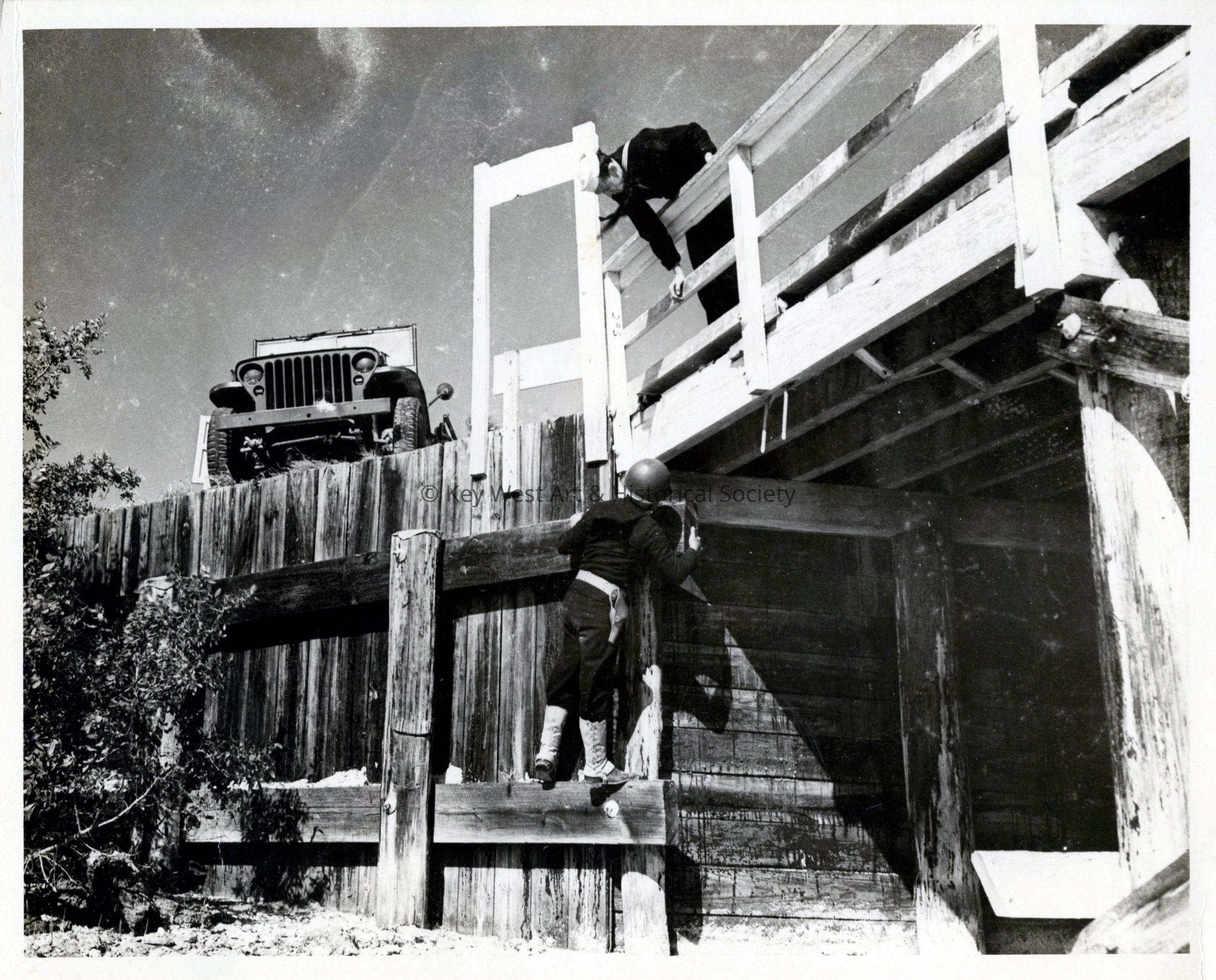 Black and white photograph of United States Navy personnel inspecting a bridge on the Overseas Highway for possible sabotage during World War II.