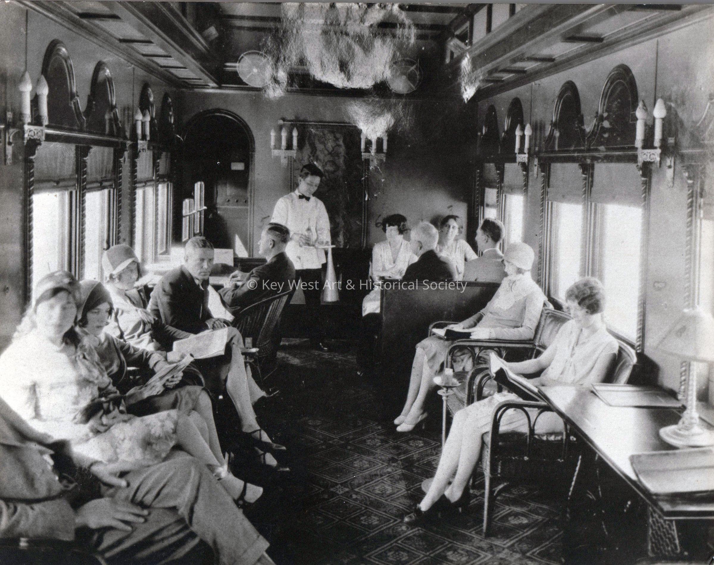Black and white photograph of passengers and waiter inside the club car on the Florida East Coast Railway. Passengers include Rosie Baker, Mrs. Kirtland, Kingman Curry, Minnie Porter Harris, Mr. N.C. Hall, Ilee Williams, Mr. Kirtland, Zuela Russel and Min Warren.Photograph Details