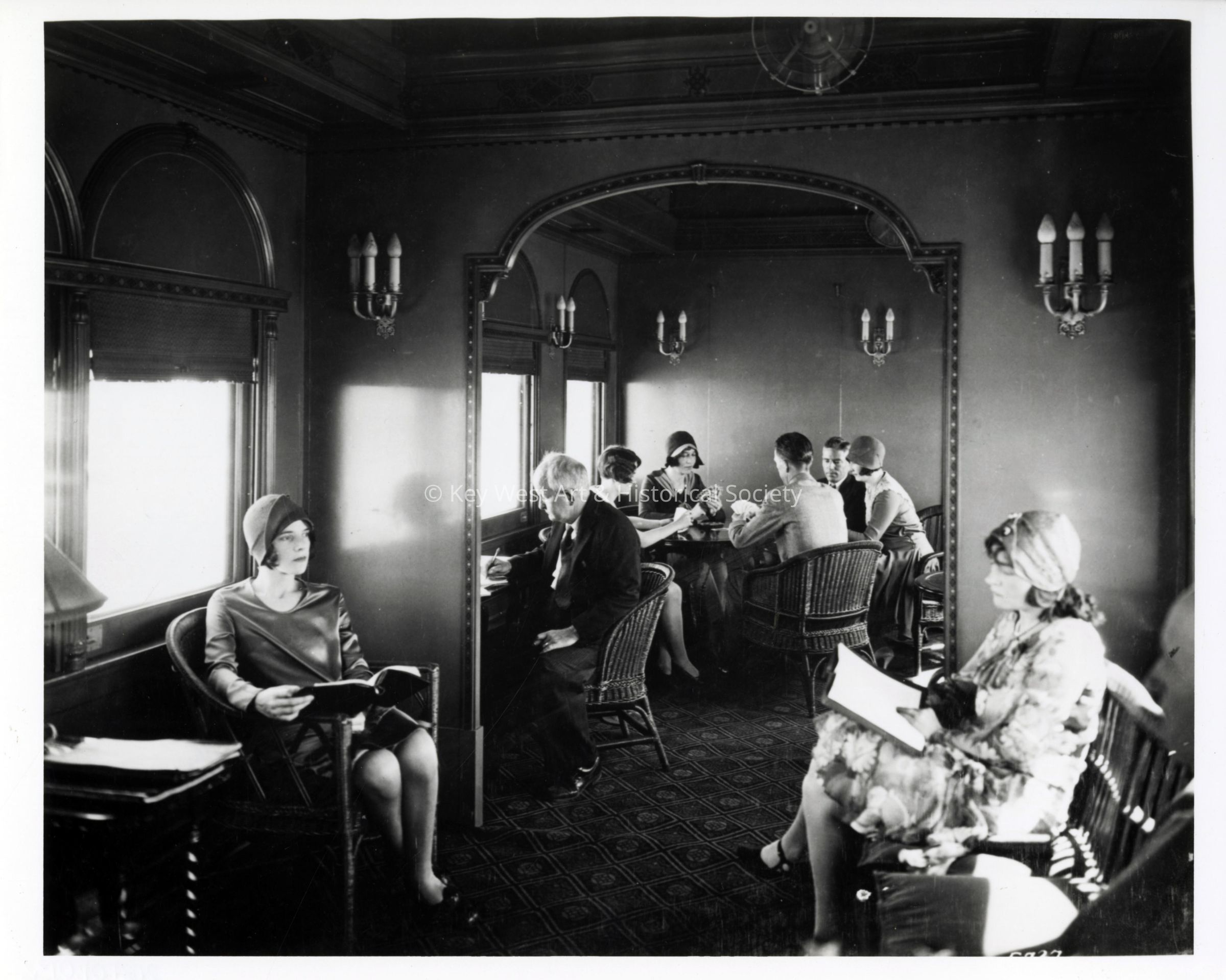 Black and white photograph of passengers inside the club car on the Florida East Coast Railway train.