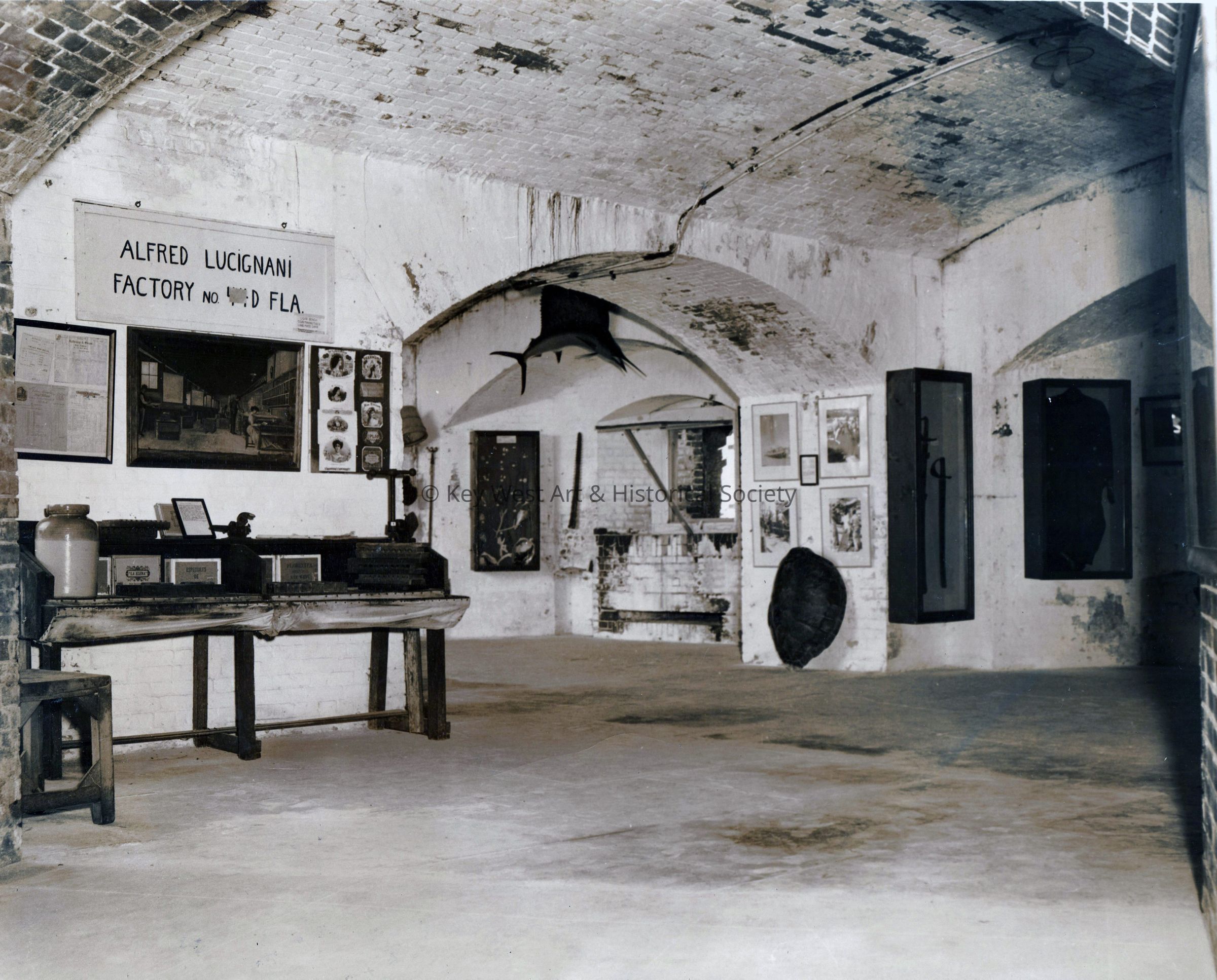 Black and white photo showing the interior of Fort East Martello Museum. Displays include cigarmakers tables, turtle shells and Civil War weapons.