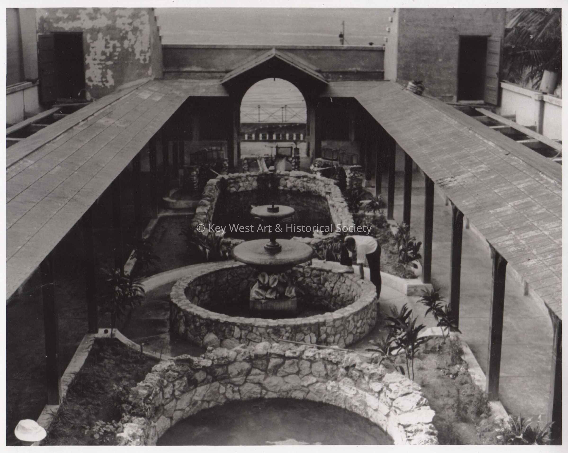 Black and white photograph depicting the interior of the open-air Key West Aquarium that was constructed during the Great Depression.