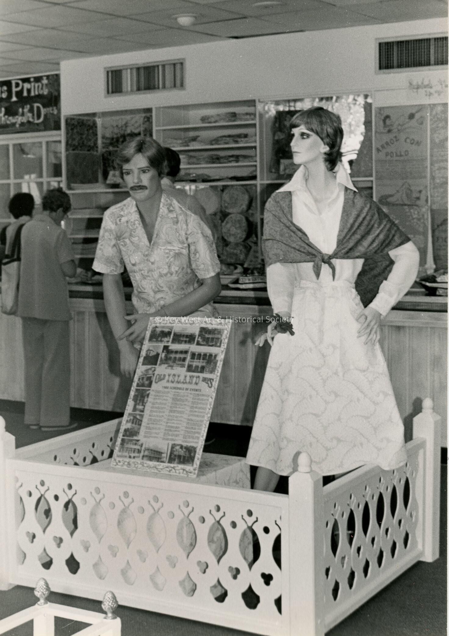Black and white photograph of the interior of Key West Hand Print Fabrics. Two mannequins in the foreground.Collection