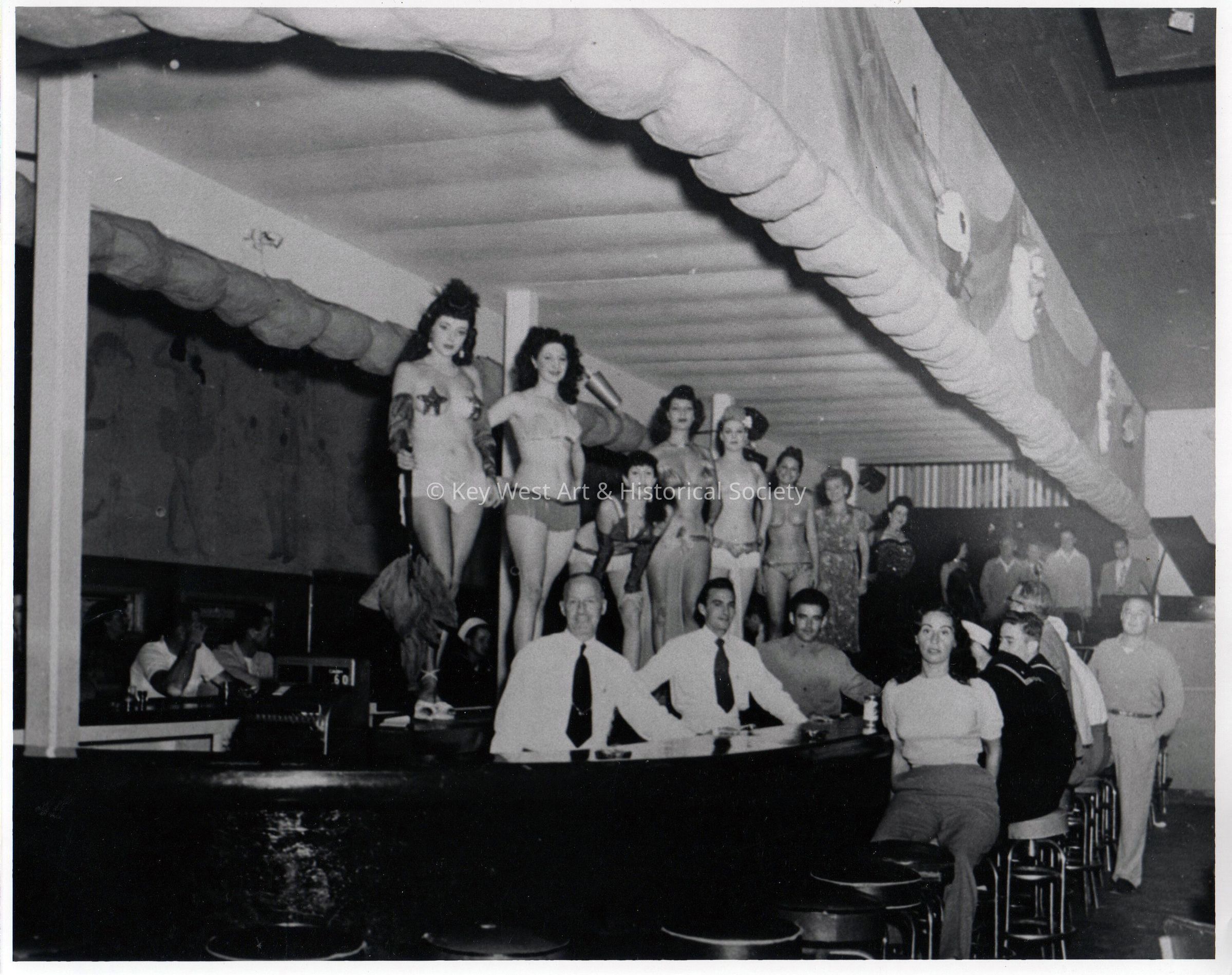 Black and white photograph of the interior of the Mardi Gras Nightclub at 92 Duval Street.