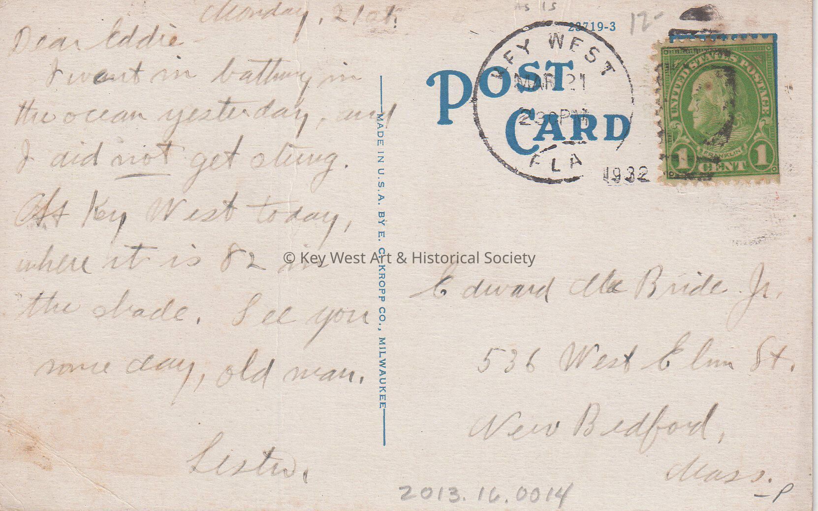 Postcard depicting a brick fort. The caption reads, ‘Interior of Martello Tower Number 2, Key West, Florida’. The message on the verso reads, ‘Monday, 21st, Dear Eddie, I went in bathing in the ocean yesterday, and I did not get stung. Off Key West today, where it is 82 in the shade. See you some day, old man. Lester'. The card is addressed to Edward McBride, Jr., 536 West Elm Street, New Bedford, Massachusetts, and is postmarked Key West, March 21, 1932.Subject Place