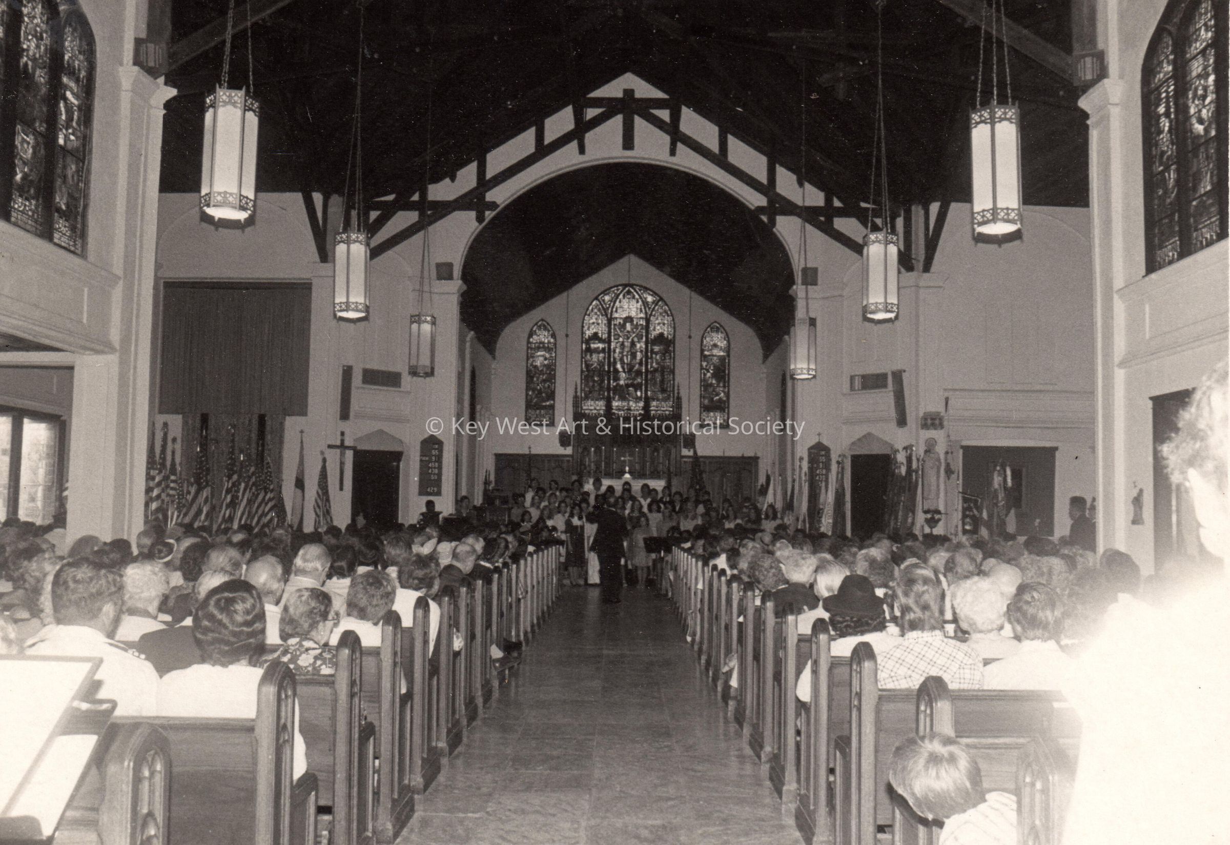 Black and white photograph of the interior of St. Paul's Episcopal Church at 401 Duval Street.Photograph Details
