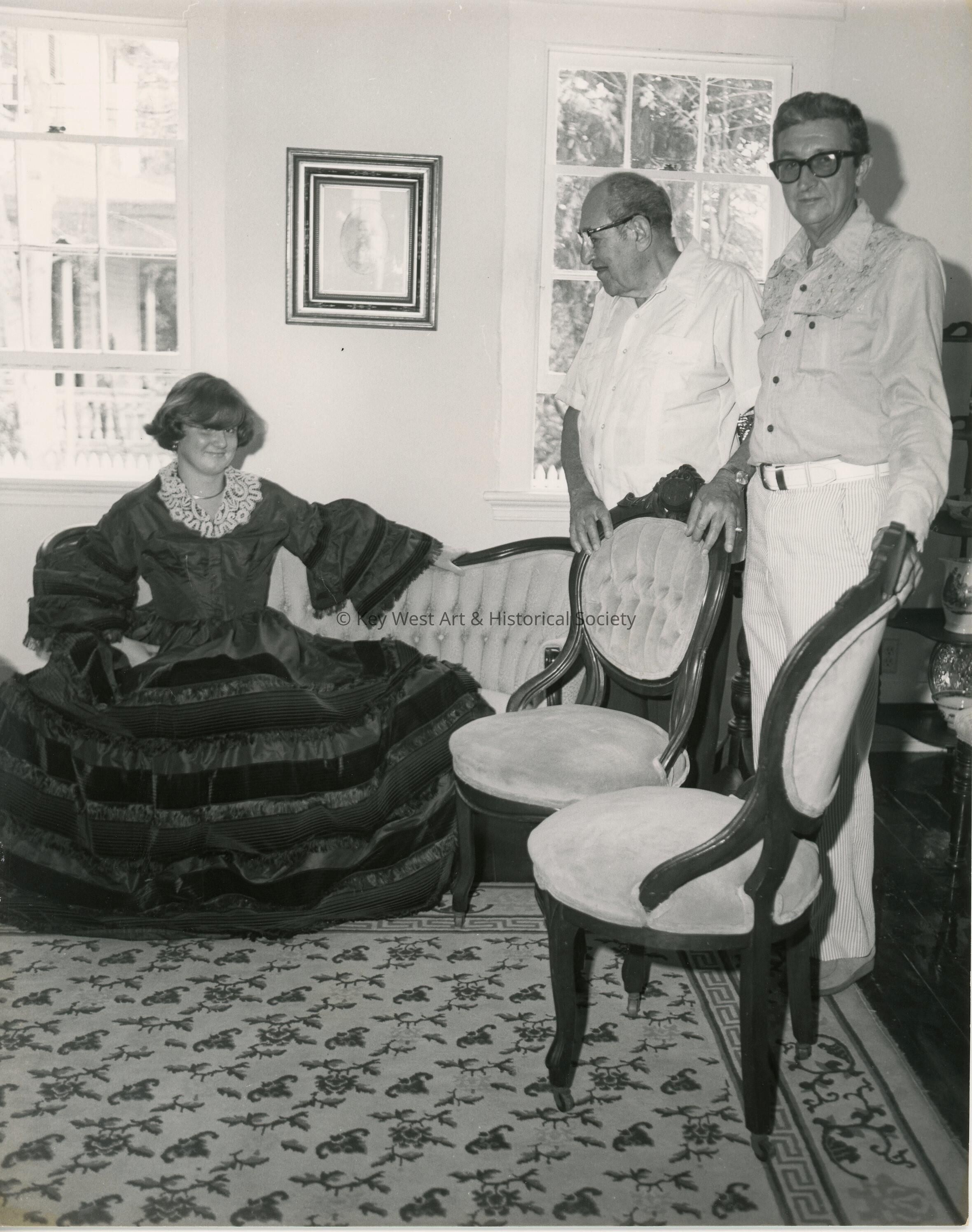 Black and white photograph of two unknown men and one woman (in period costume) possibly inside the Oldest House at 322 Duval Street.
