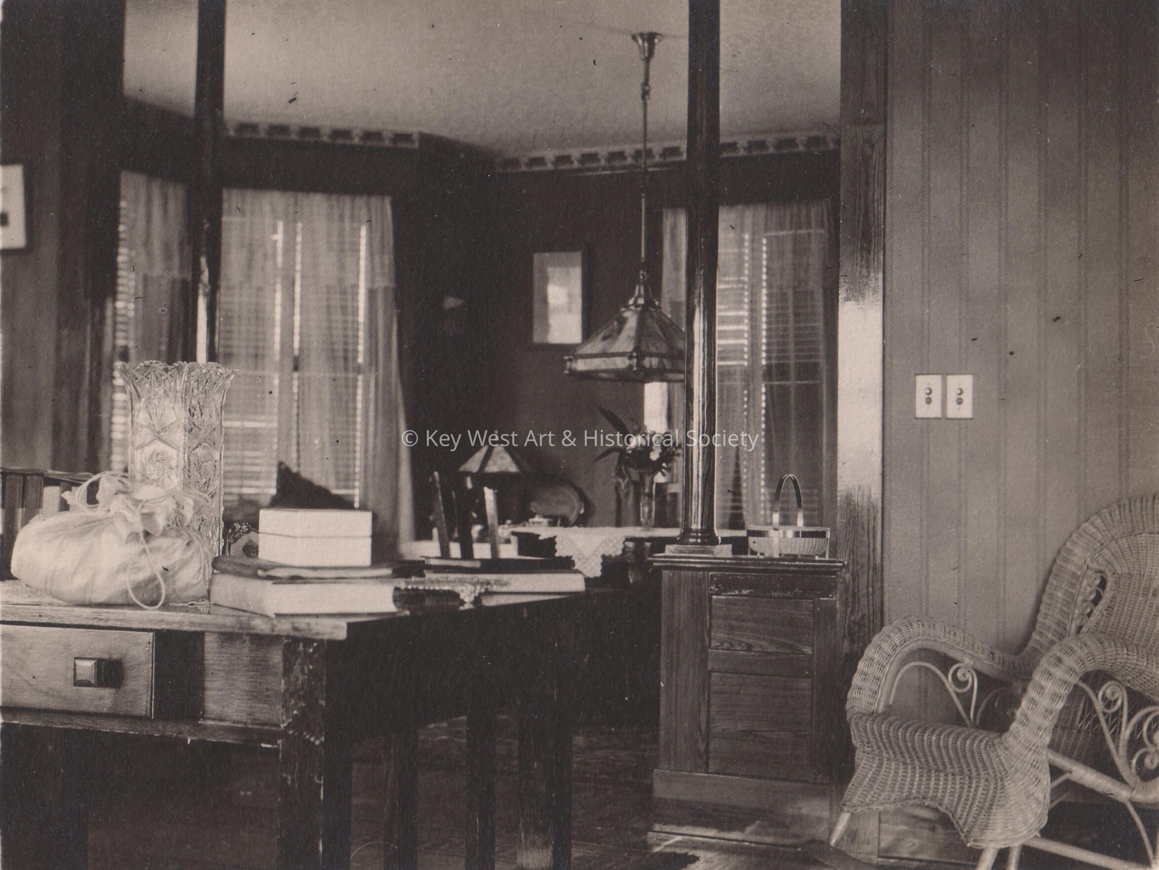 Black and white photograph of the interior of an unknown Key West house. Note on verso reads, 'looking across living room into dining room'.