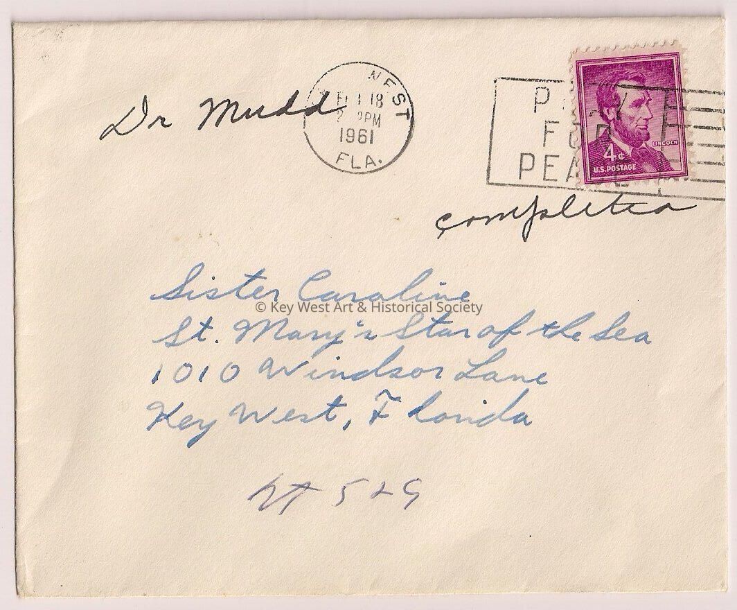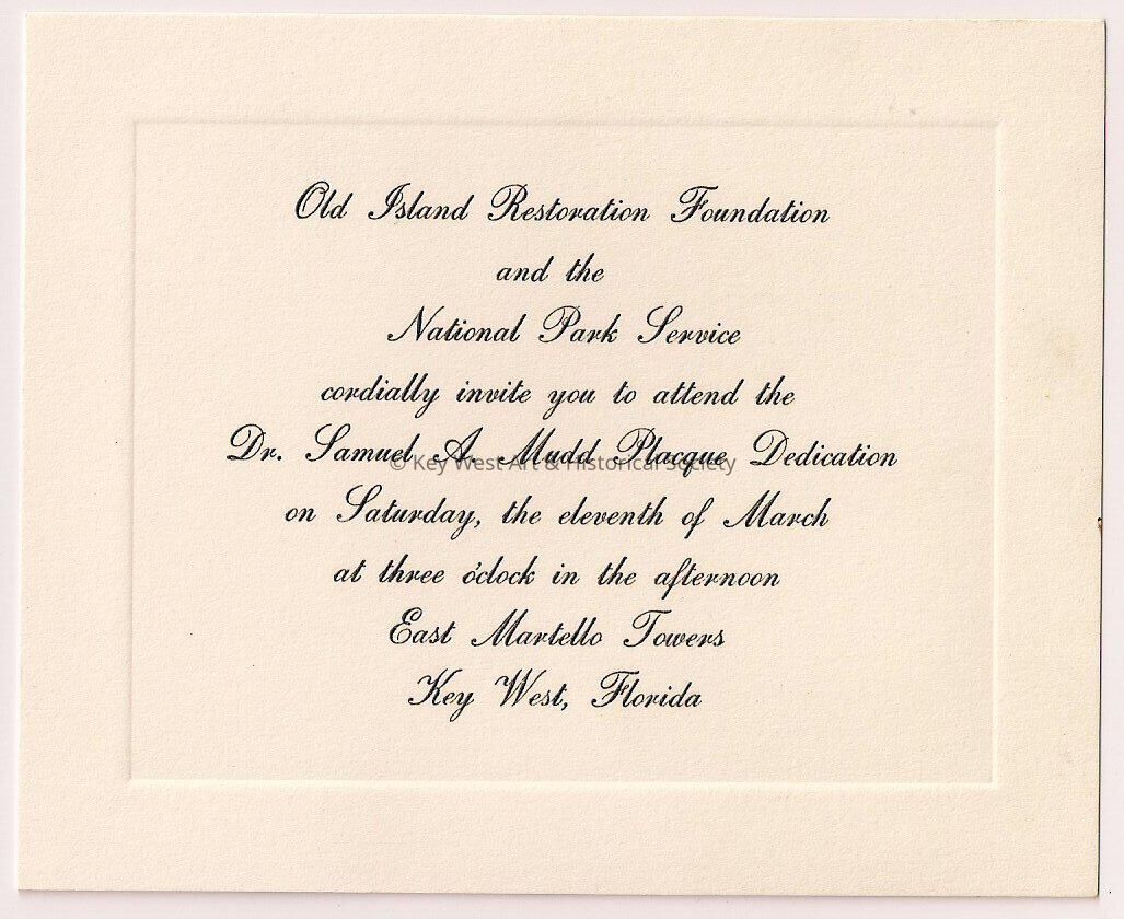 Invitation to the plaque dedication ceremony for Dr. Samuel Mudd. Invitation is addressed to Sister Caroline at St. Mary's Star of the Sea.
