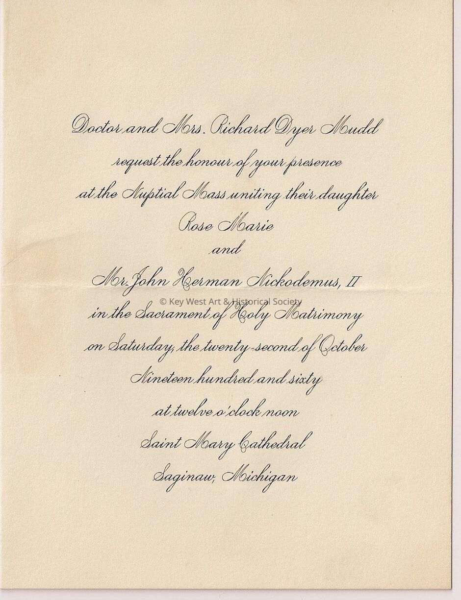 Invitation to the wedding of Rose Marie (great-granddaughter to Dr. Samuel Mudd) and John Herman Nickodemus II. Rose is the daughter of Dr. Richard Dyer Mudd grandson of Dr. Samuel Mudd.