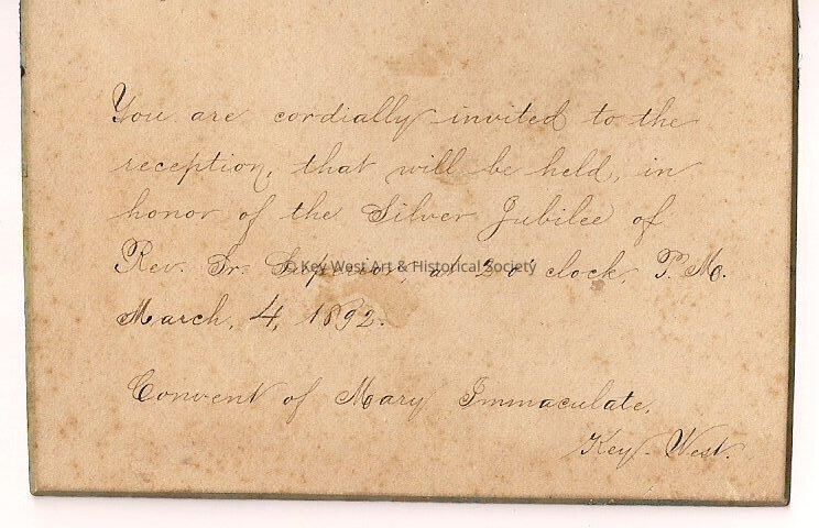 'You are cordially invited to the reception that will be held in honor of the Silver Jubilee of Rev. Sr. Superior, at 2 o' clock. March 4, 1892. Convent of Mary Immaculate, Key West.'