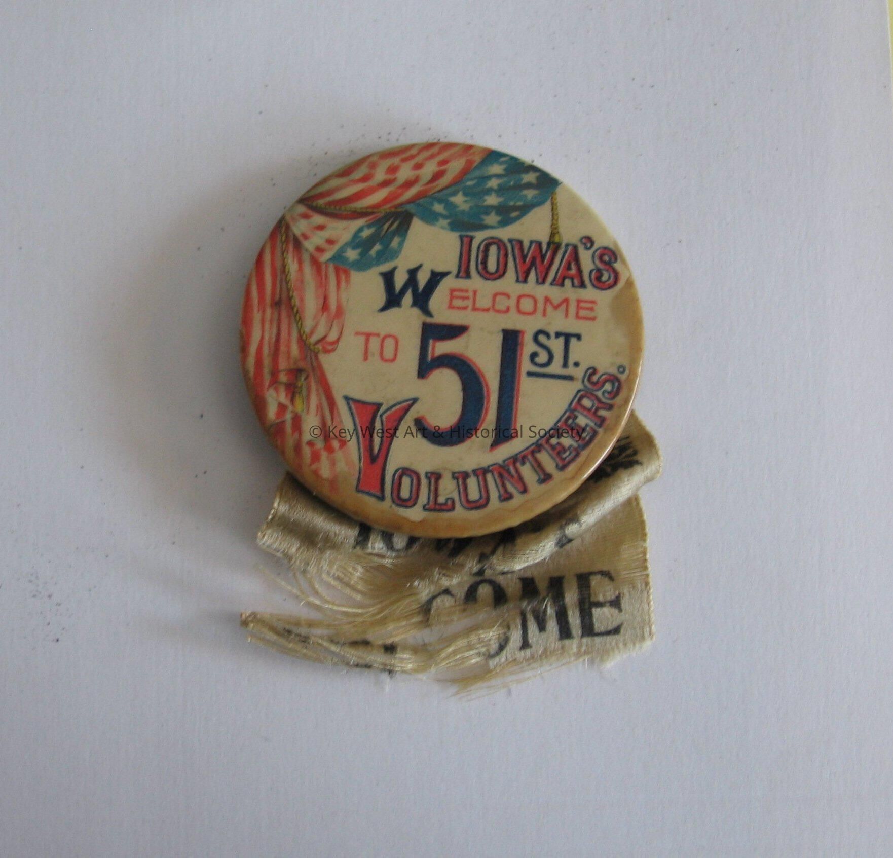 Celluloid pinback button that reads 'Iowa's Welcome to 51st Volunteers'. A white silk ribbon was once attached but has become separated. Button was made as part of the celebration to welcome home the Iowa 51st Volunteer Infantry after the close of the Spanish-American War.Collection