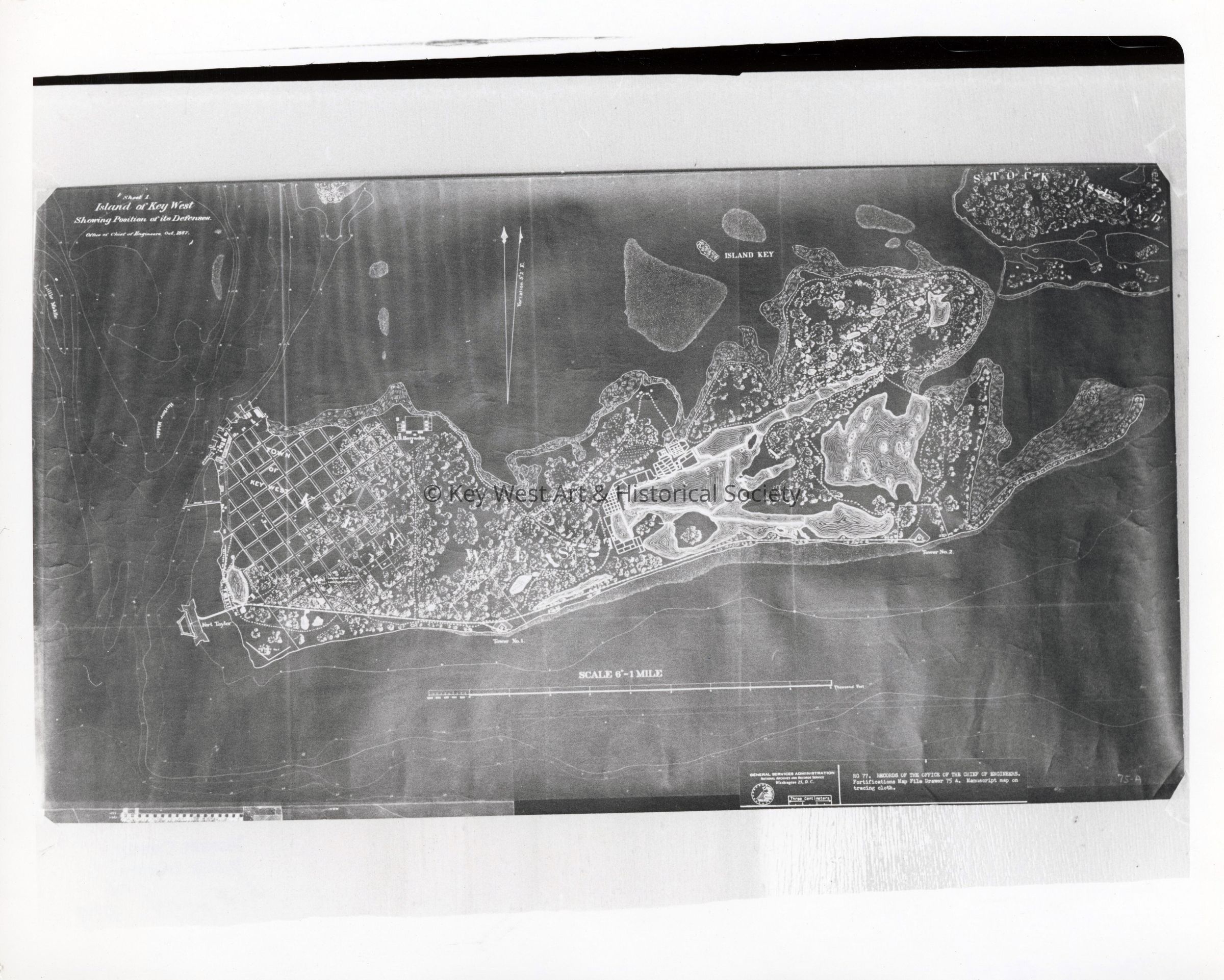 Black and white photograph of a Key West map. Caption reads, 'Island of Key West, showing position of the defenses.'