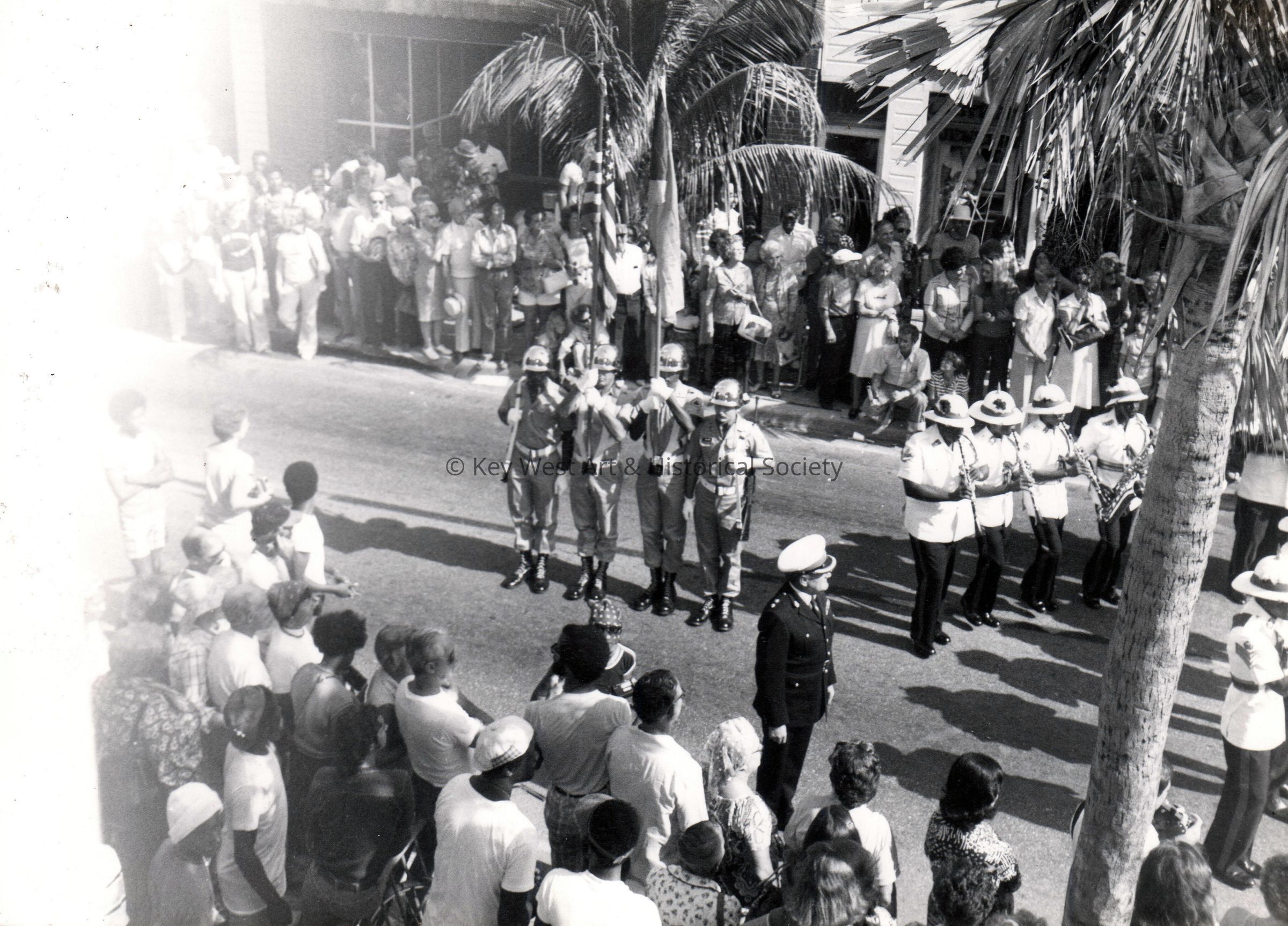 Black and white photograph of the color guard at the Island Roots Festival.Photograph Details