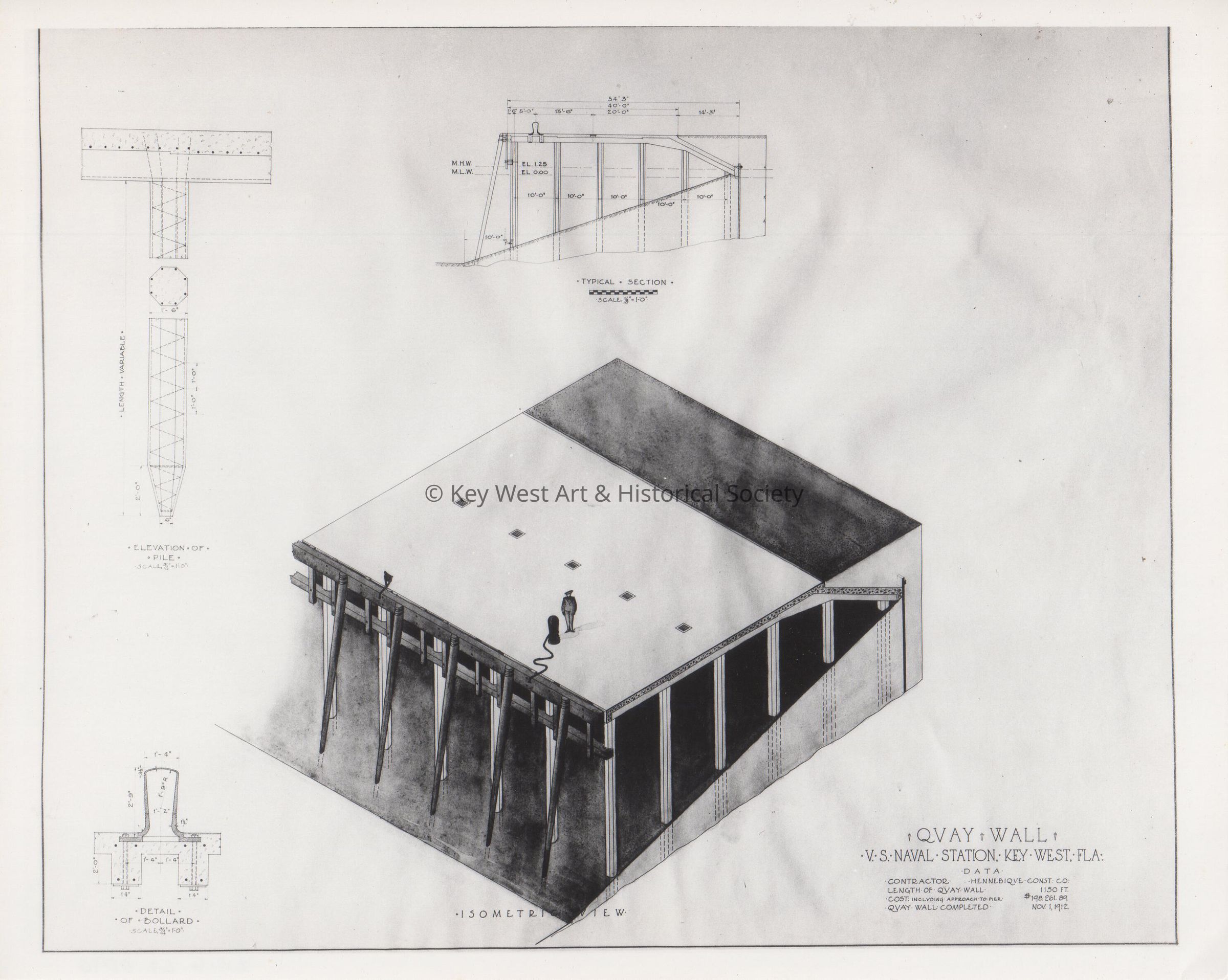 Isometric View, Quay Wall, U.S. Naval Station Key West, Florida. Detail of Bollard, Elevation of Pile, Typical Section.Copyright