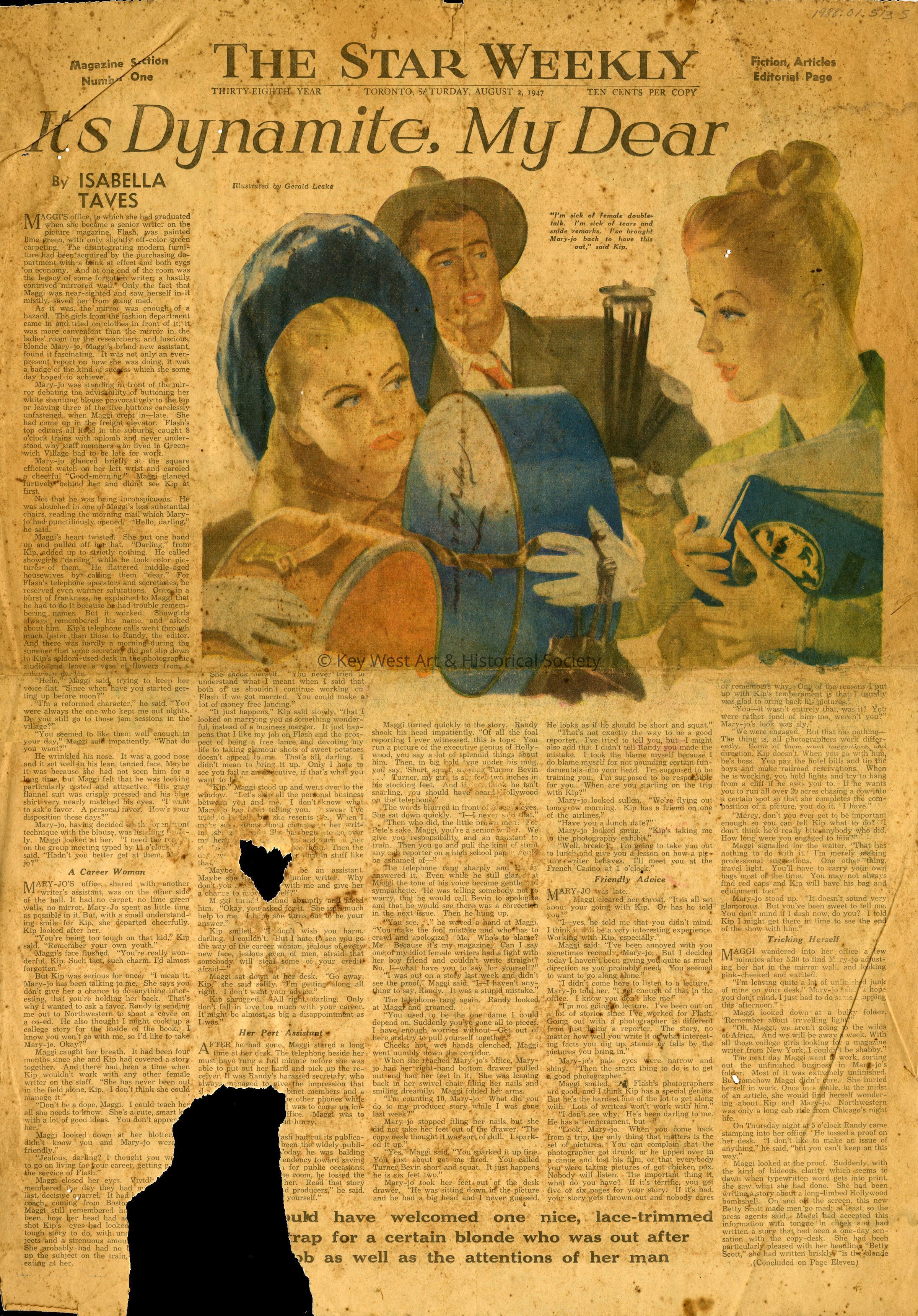 One page newspaper serial story entitled 'It's Dynamite, My Dear' written by Isabella Taves and illustrated by Gerald Leake. The serial appeared in The Star Weekly newspaper based in Toronto, Canada.Collection