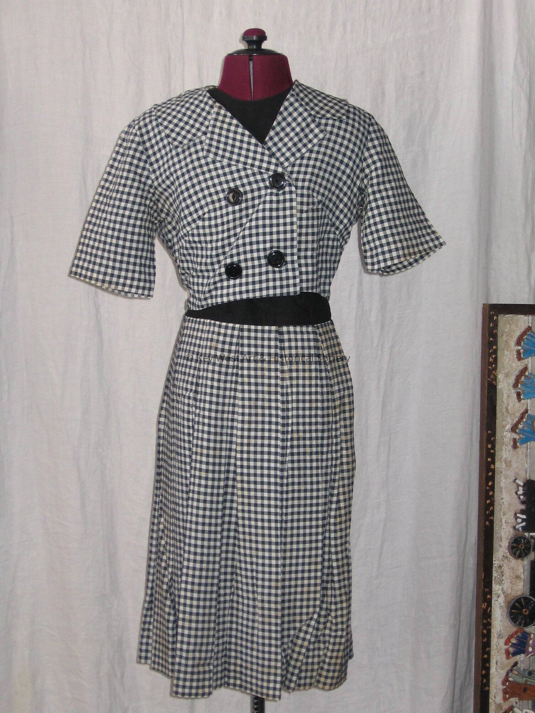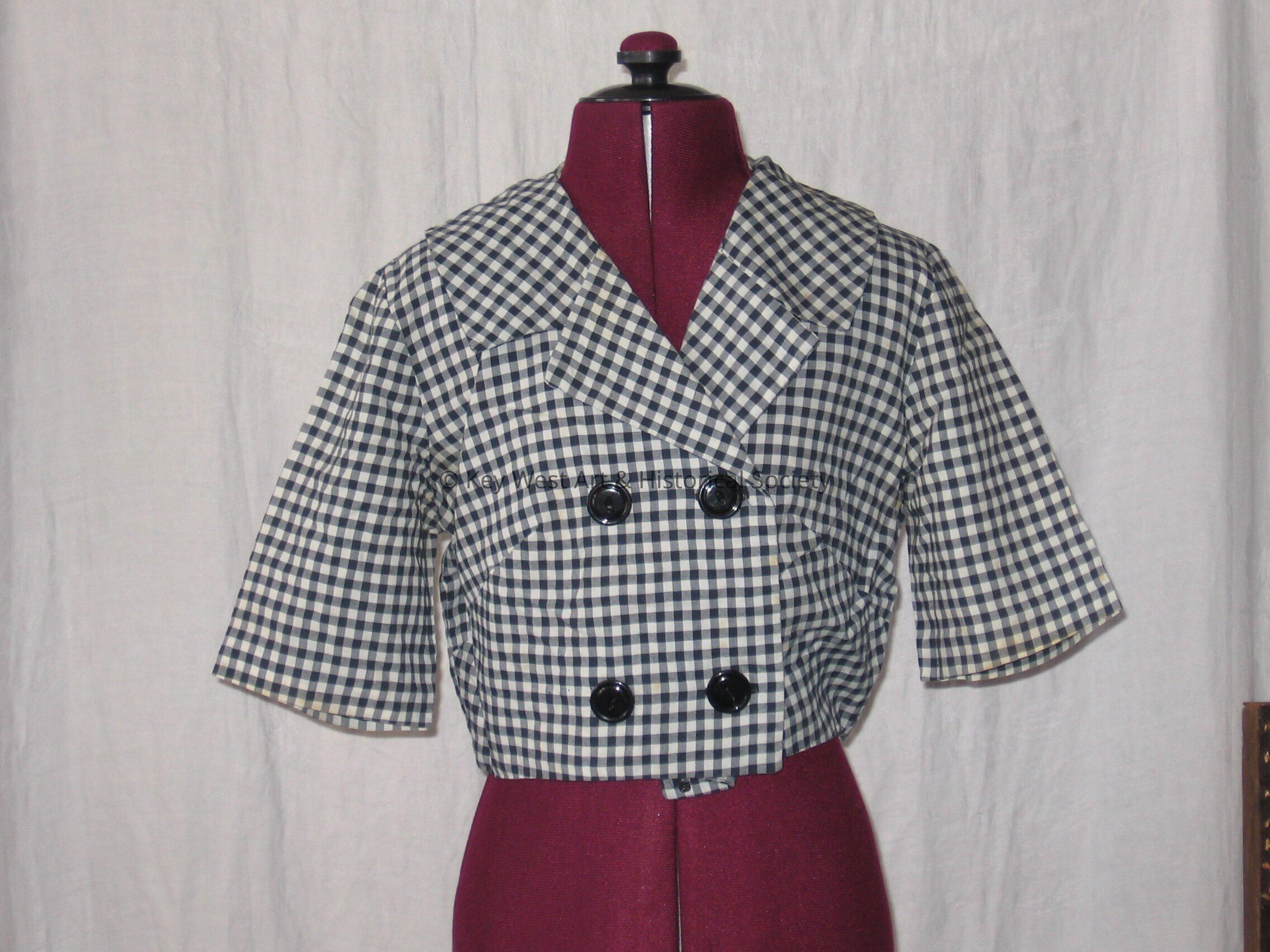 Double breasted jacket with four buttons and a wide collar. The jacket has a black and white checkered pattern. Goes with a matching dress.
