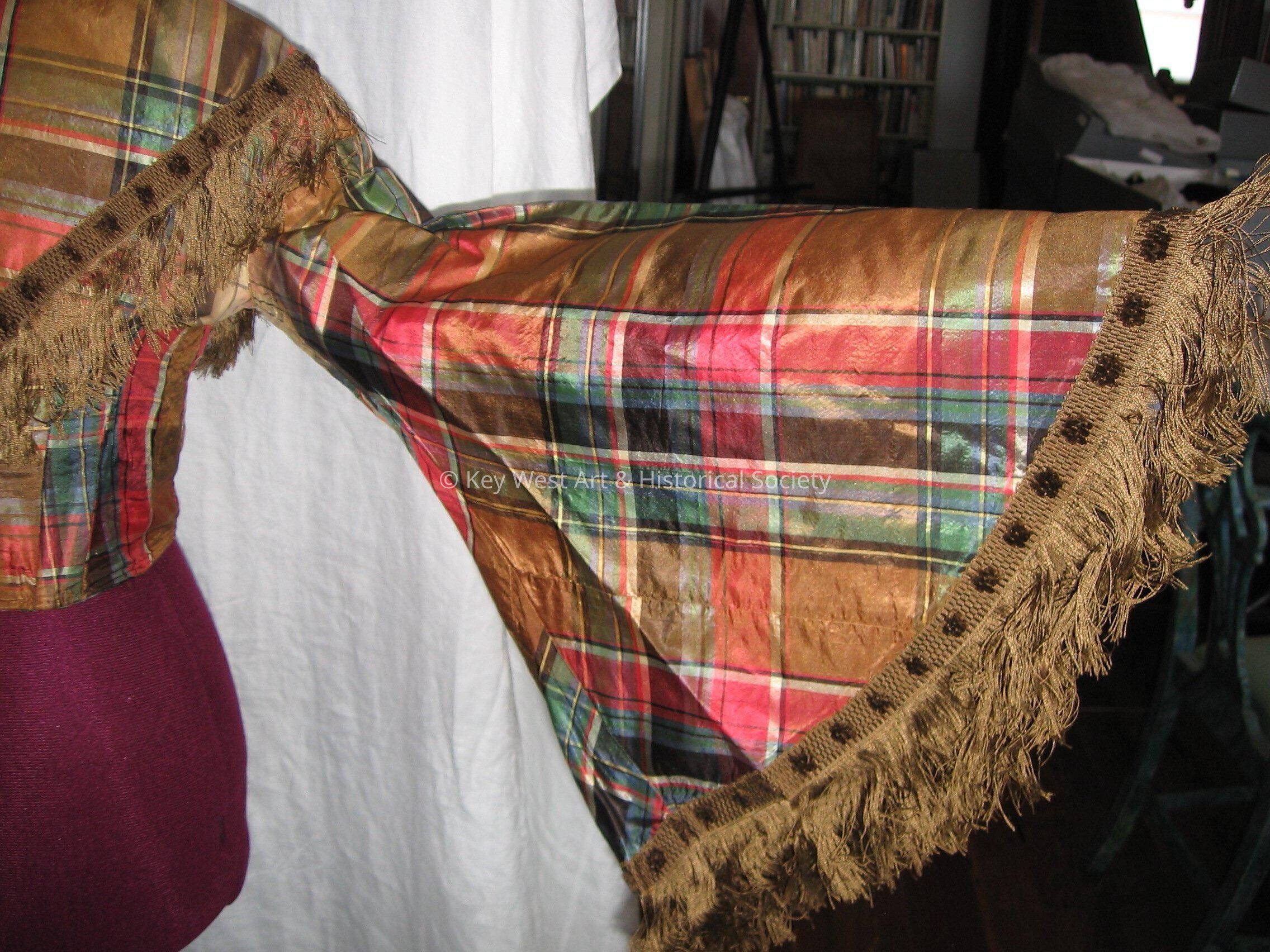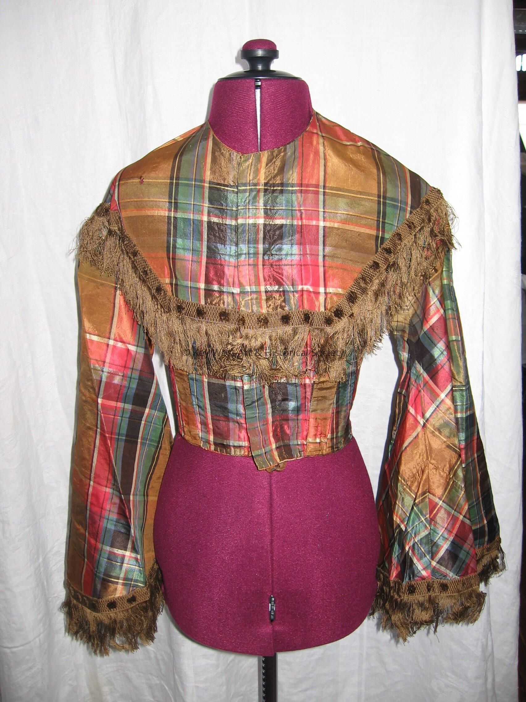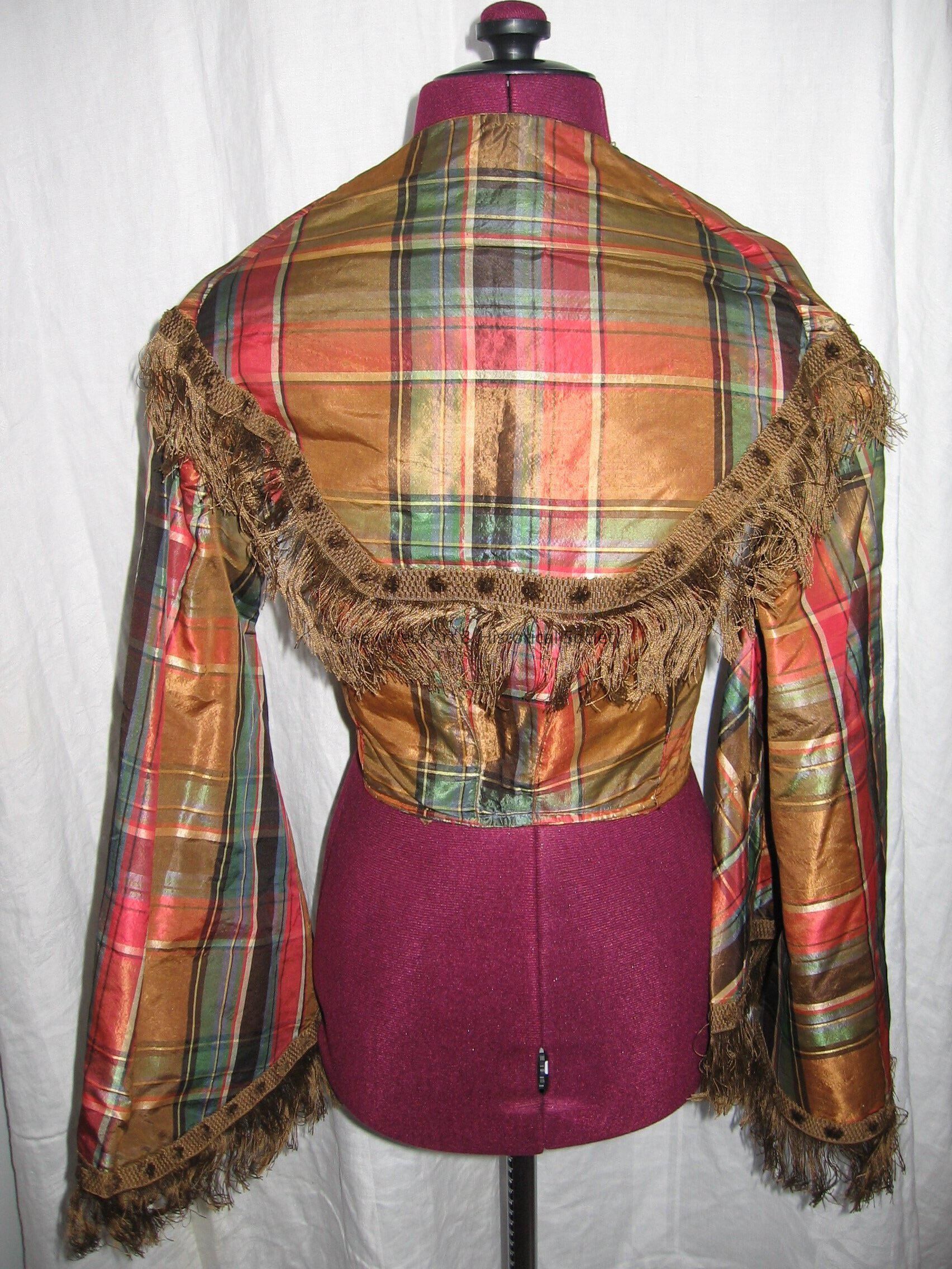 Taffeta plaid high waist jacket or blouse. Hook and eye front closure. Bell sleeves. Fringe trim on sleeves and collar.