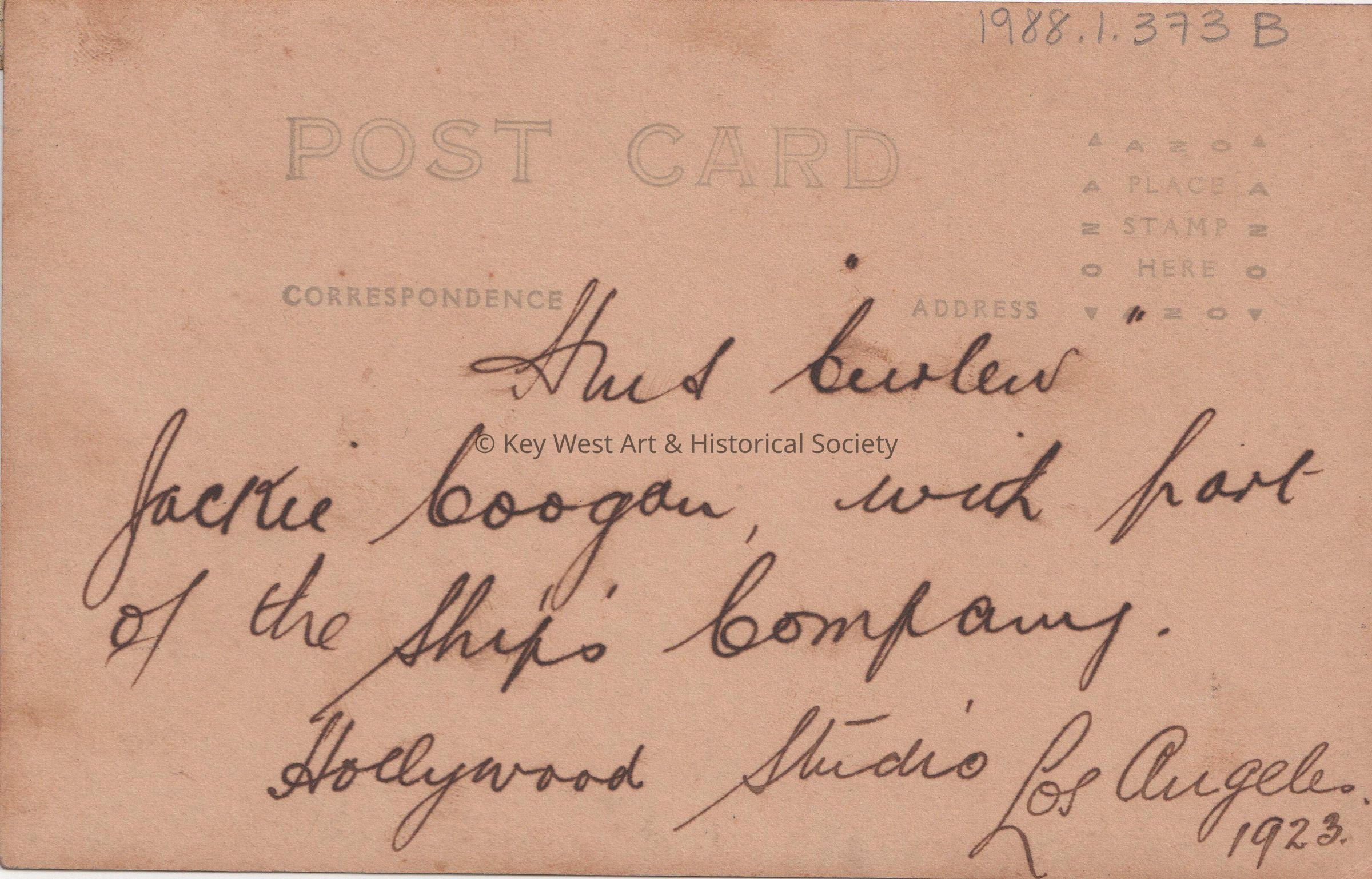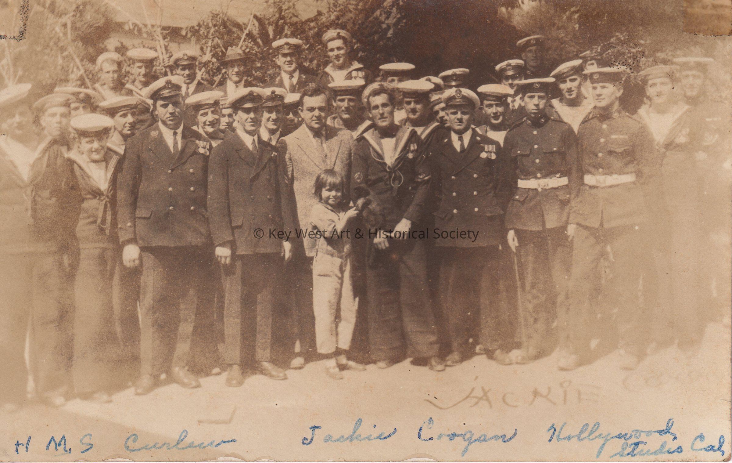 Postcard of a group of sailors, a man, and a boy. Written on the front of the card is ‘HMS Curlew. Jackie Coogan, Hollywood Studio, California'. A note on the verso reads, ‘HMS Curlew Jackie Coogan with part of the ship’s company. Hollywood Studios, Los Angeles, 1923.’Collection