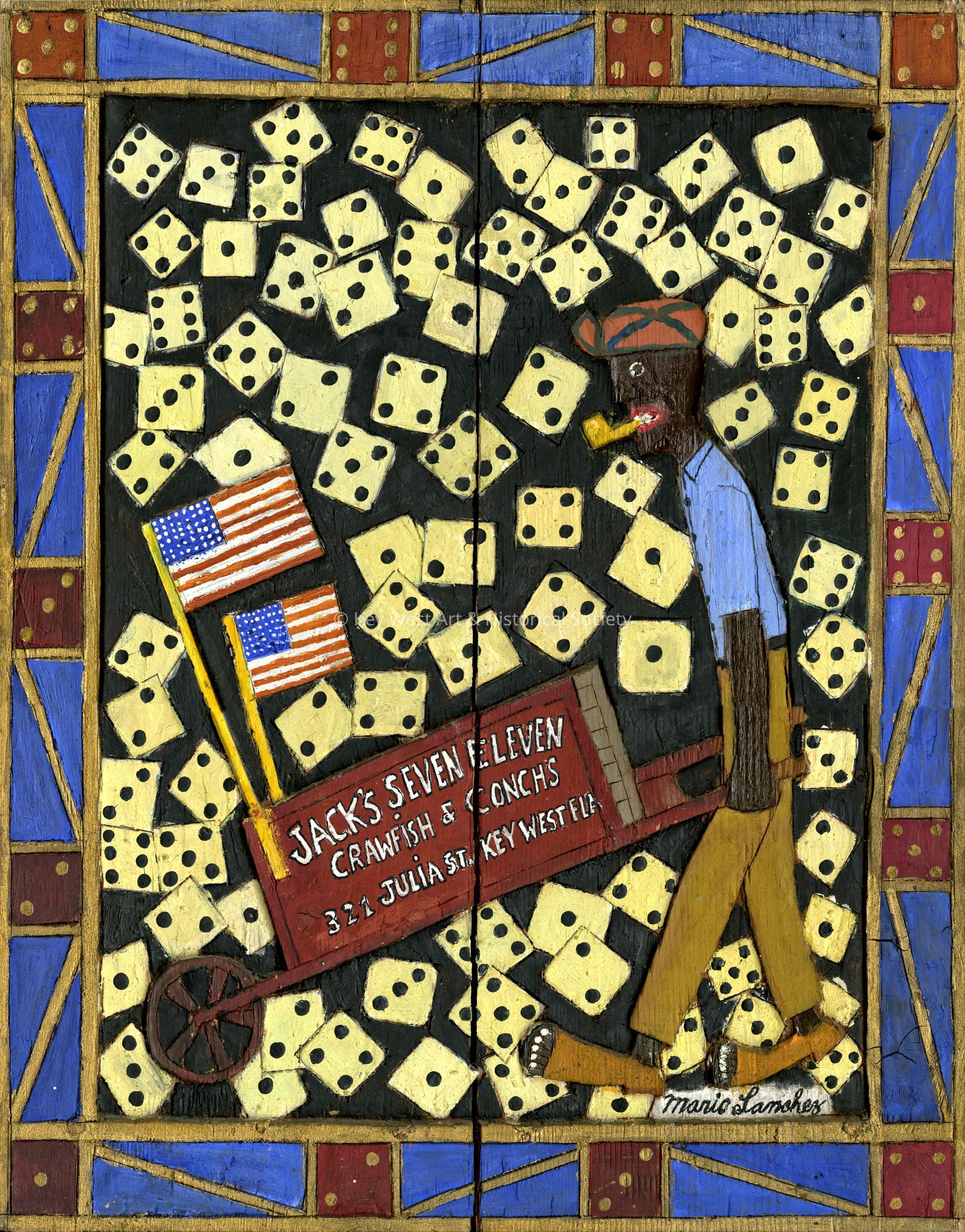 Woodcarving by Mario Sanchez depicting Jack the crawfish and conch seller pushing his handcart. Jack's address is listed as 321 Julia Street. A carved background of dice surround Jack.Type of Sculpture