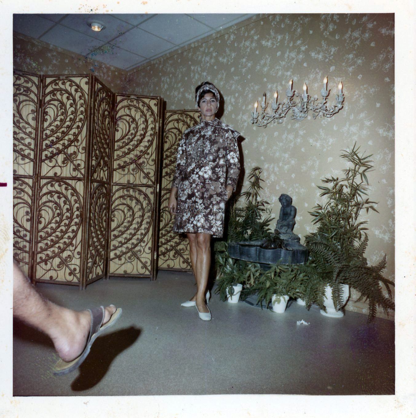 Color photograph of Jacquolyn Staubs modeling a Key West Hand Print Fabrics dress in the company's studio. Jacquolyn worked for Key West Hand Print Fabrics as a shop manager, merchandising manager, and pinners model.Photograph Details