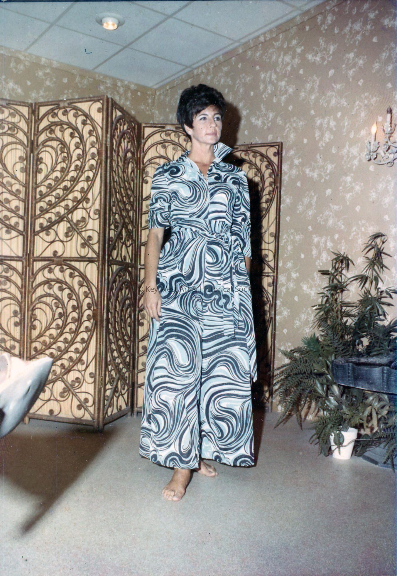 Color photograph of Jacquolyn Staubs modeling a Key West Hand Print jumpsuit in the company's studio. Jacquolyn worked for Key West Hand Print Fabrics as a shop manager, merchandising manager, and pinners model.Photograph Details