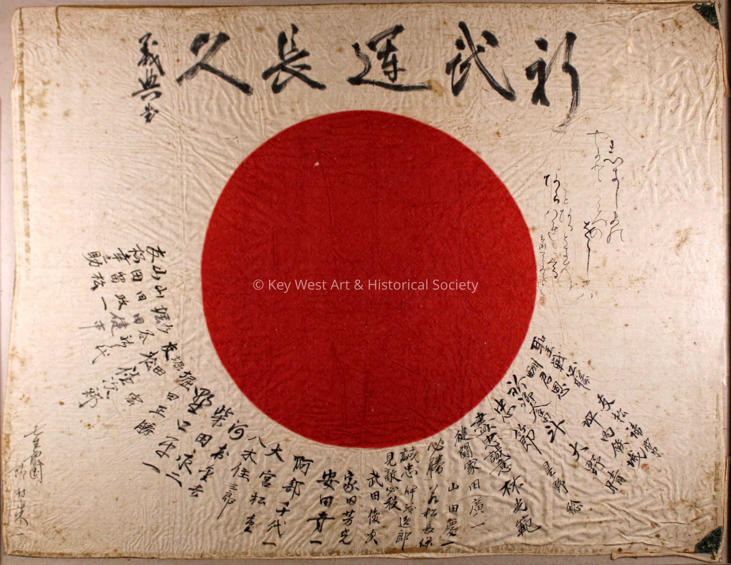 When yosegaki hinomaru were signed by friends and relatives, the text written on the flag was generally written in a vertical formation radiating out from the central red circle, resembling the sun's rays.Collection
