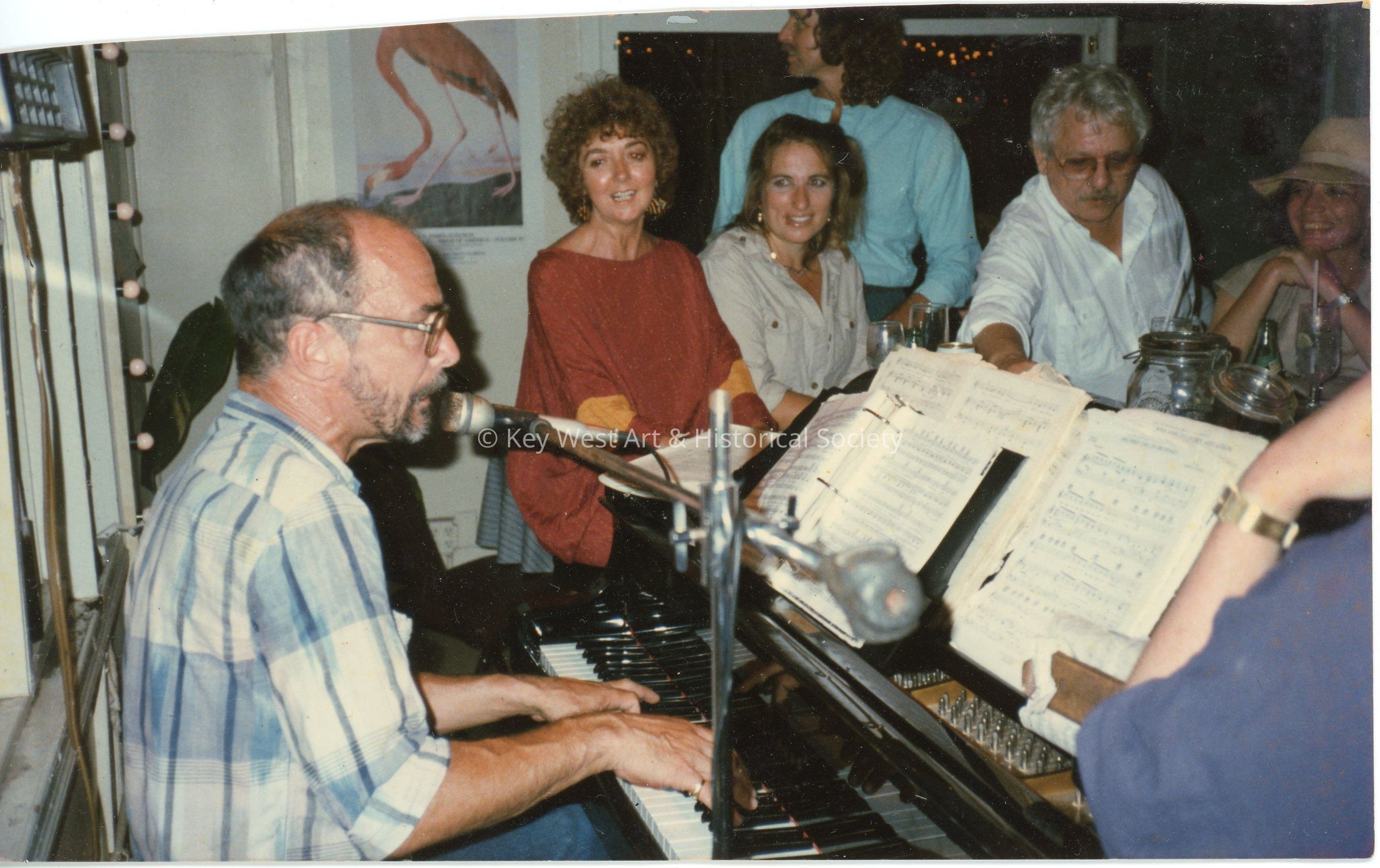William J. Foote Jr. (Jay Foote) singing and playing the piano at the Pigeon House Patio Restaurant and Bar formerly located at 301 Whitehead Street. Patrons are listening all around the piano.