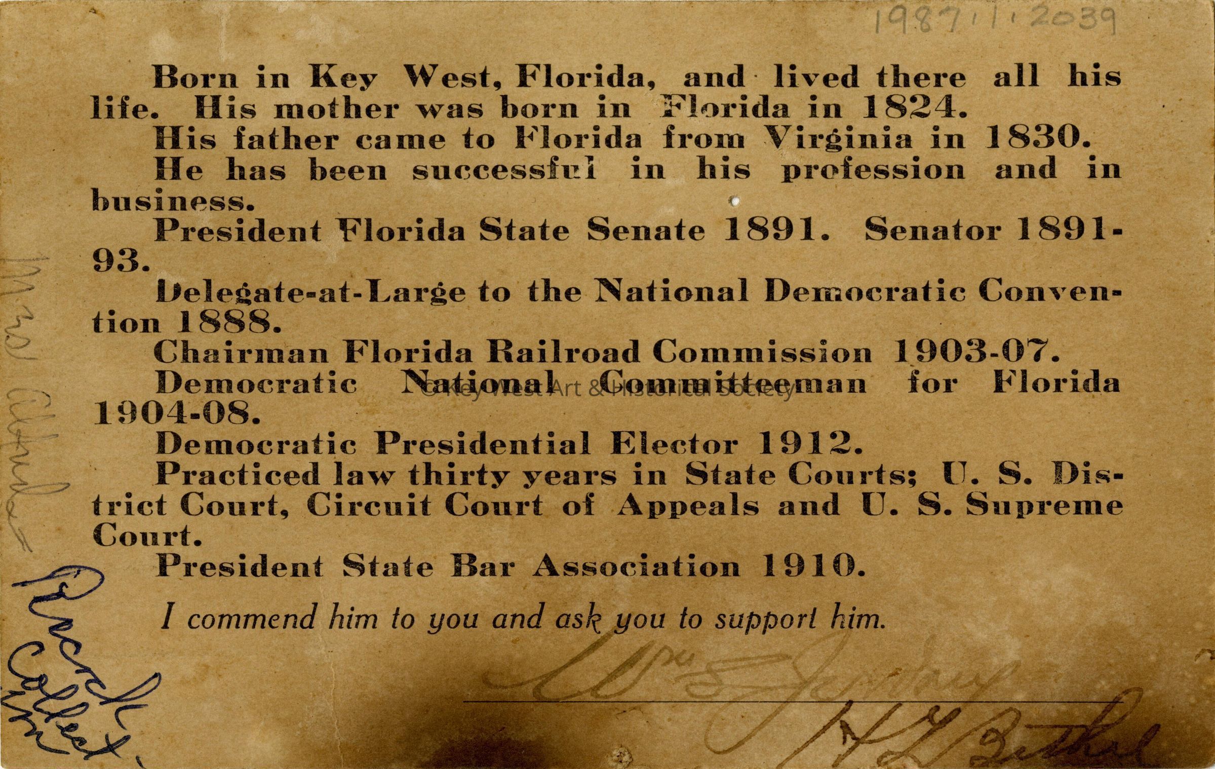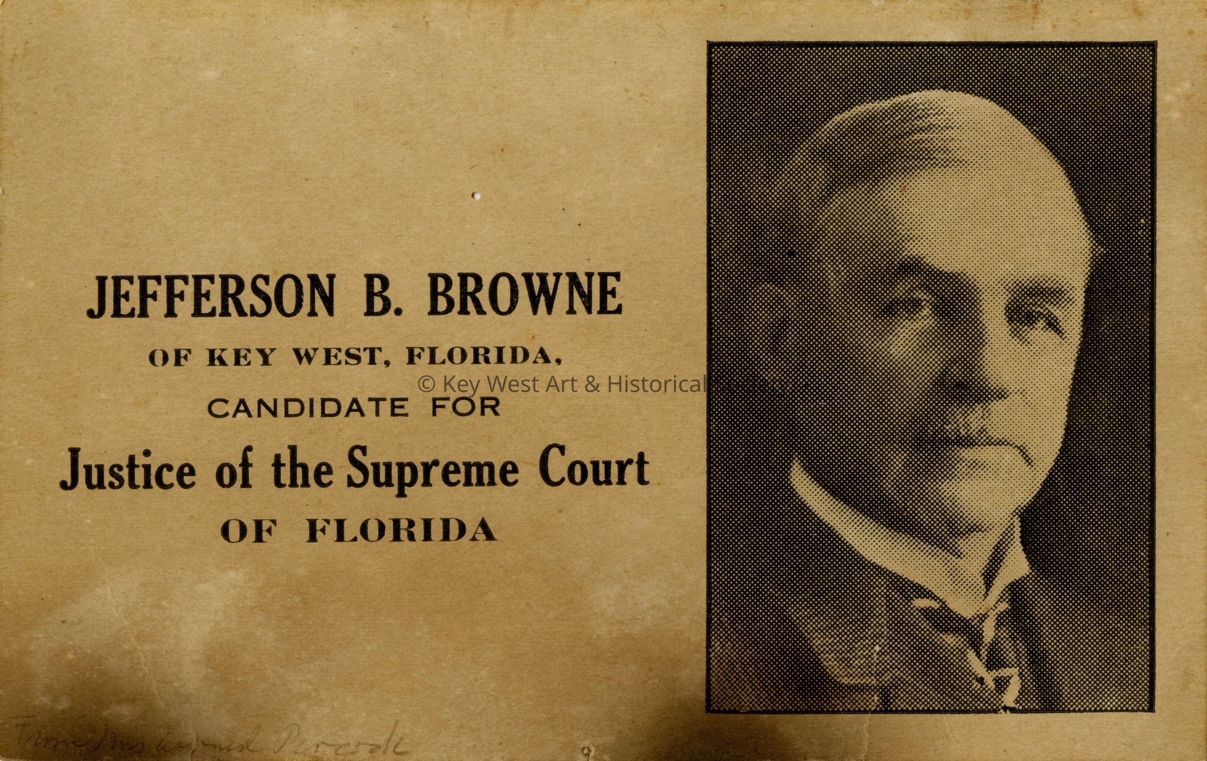 Campaign card for Jefferson B. Browne created when he was running for Justice of the Supreme Court of Florida in 1916. On the reverse of the campaign card is his resume. He is the only judge from Monroe County to ever hold that position.