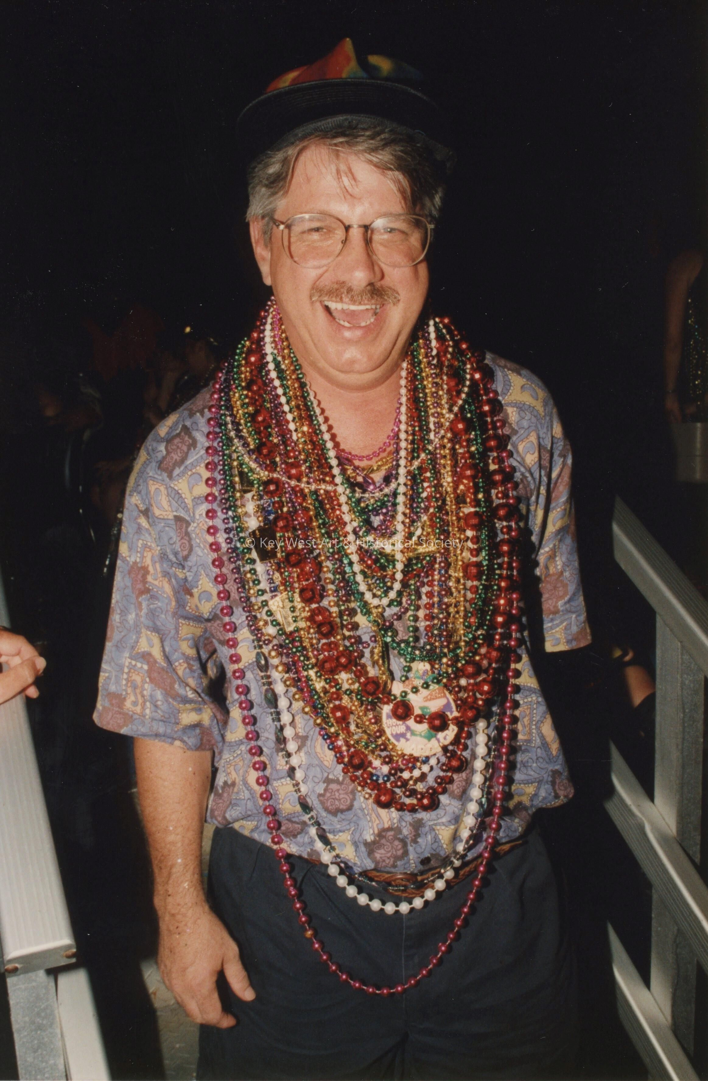 Color photograph of Jimmy Weekley wearing beads during Fantasy Fest.