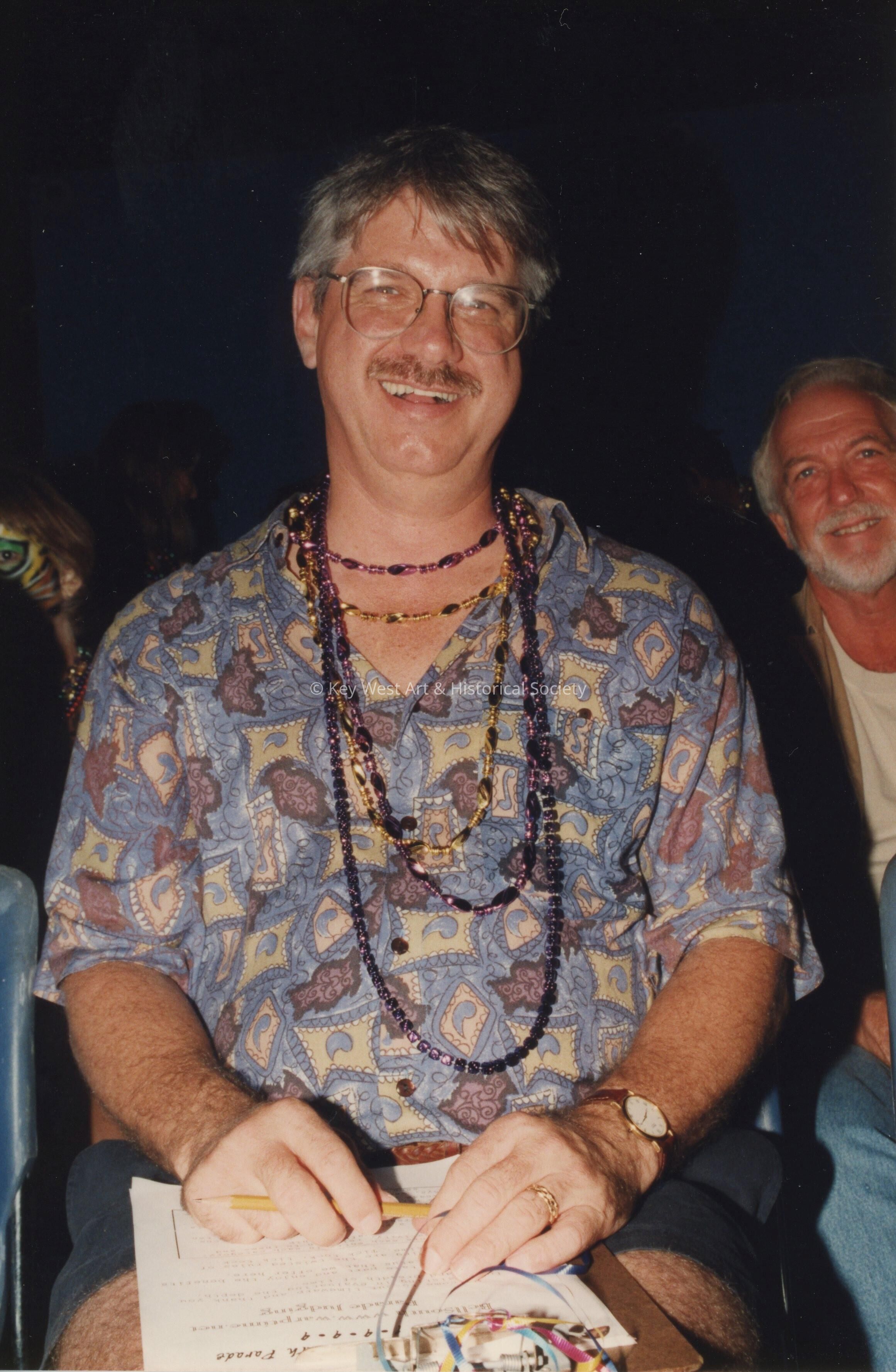 Color photograph of Jimmy Weekley acting as a judge during the Fantasy Fest parade.