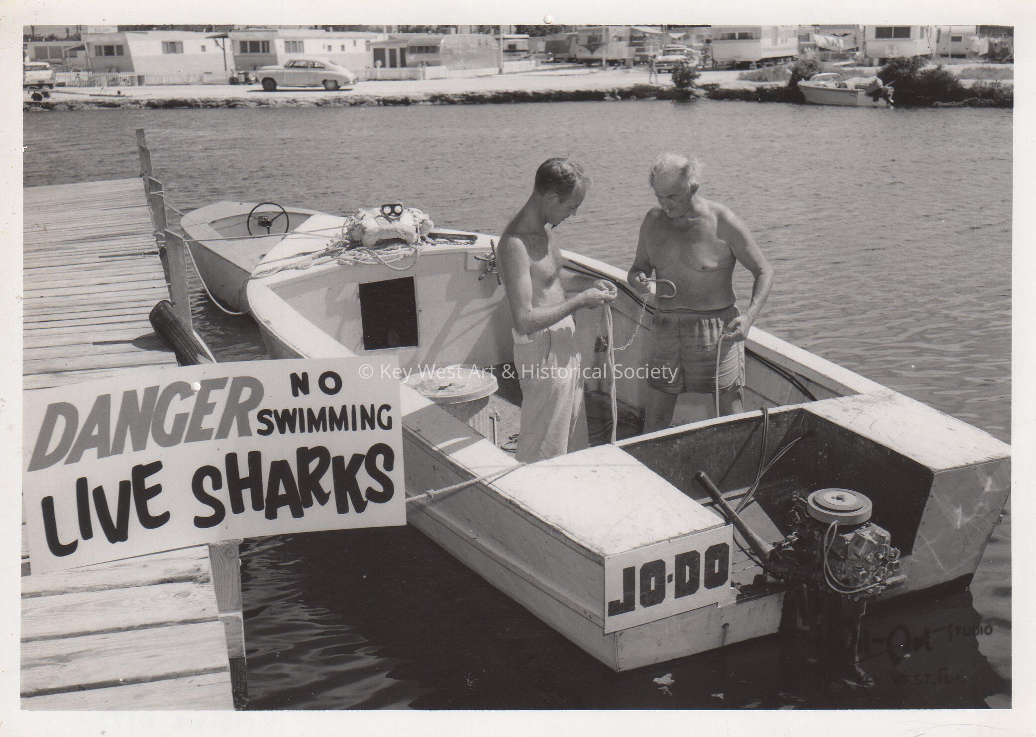 Black and white photograph of the boat JO-DO at the dock and a sign reading, 'Danger. So Swimming. Live Sharks.'