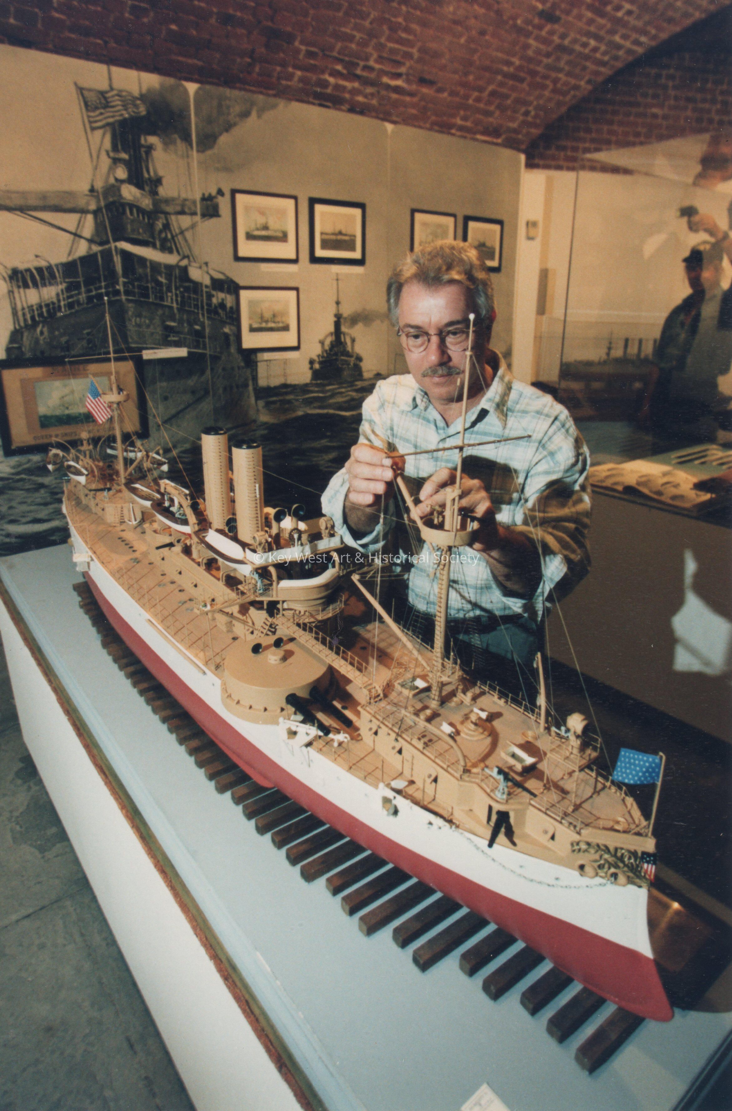 Color photograph of Joe Pais with the USS MAINE model built by Howard England at Fort East Martello Museum.