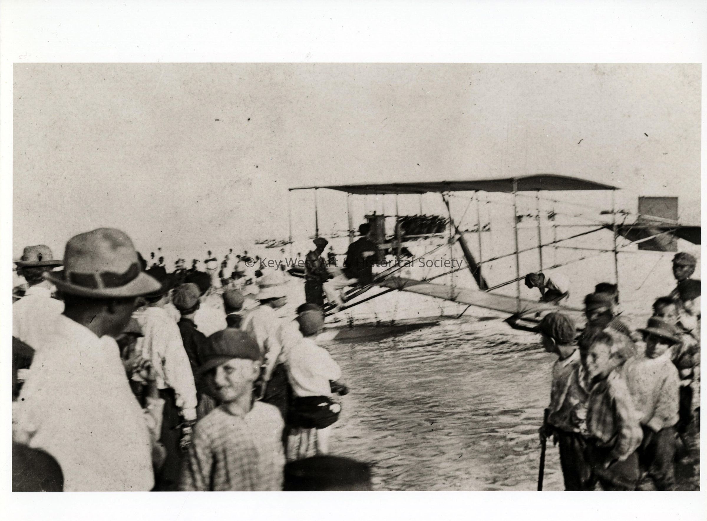 Black and white photograph of John Alexander Douglas McCurdy and his airplane before his failed flight attempt from Key West to Cuba.