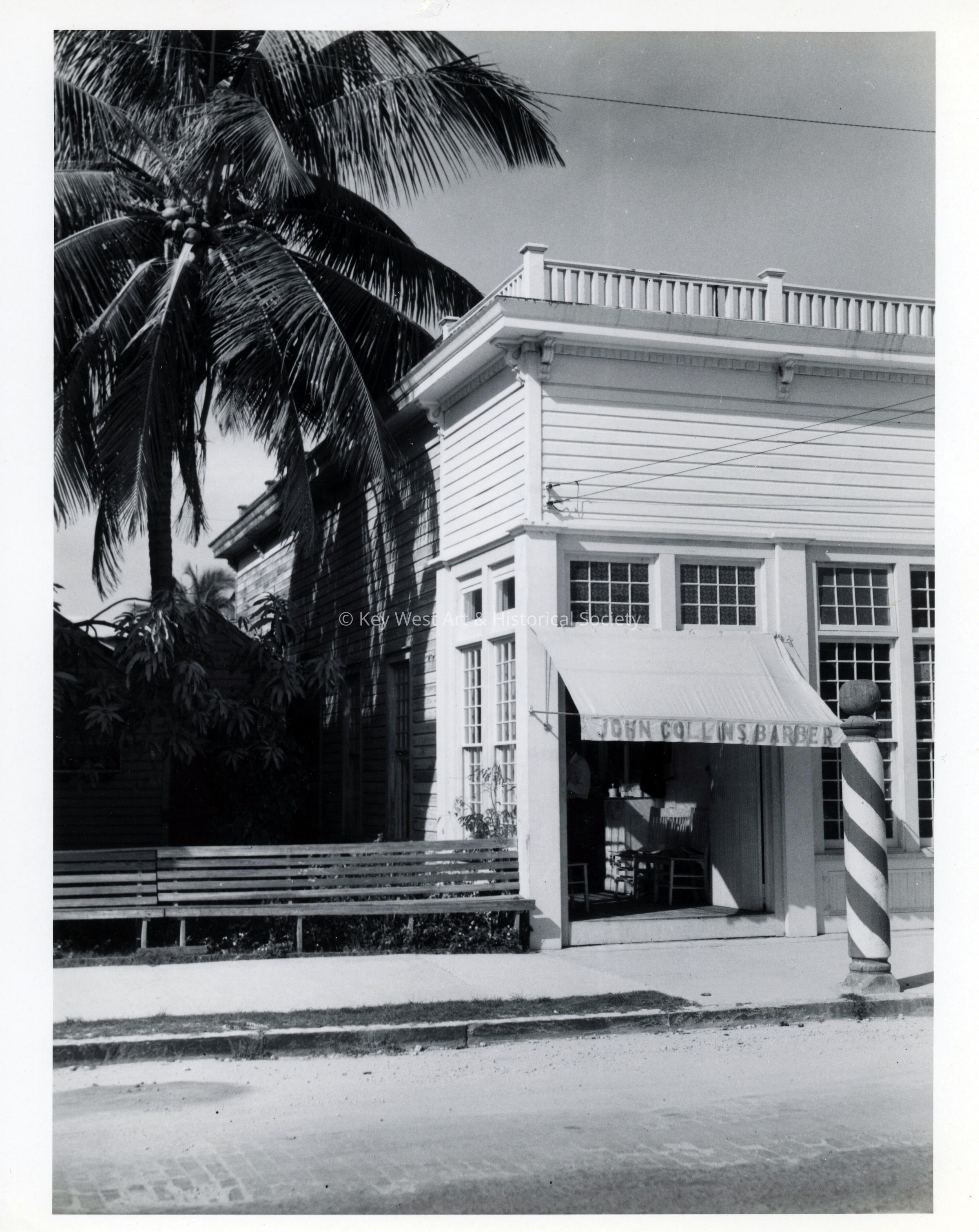 Black and white photograph of John Collins Barbershop, possibly on Duval Street.