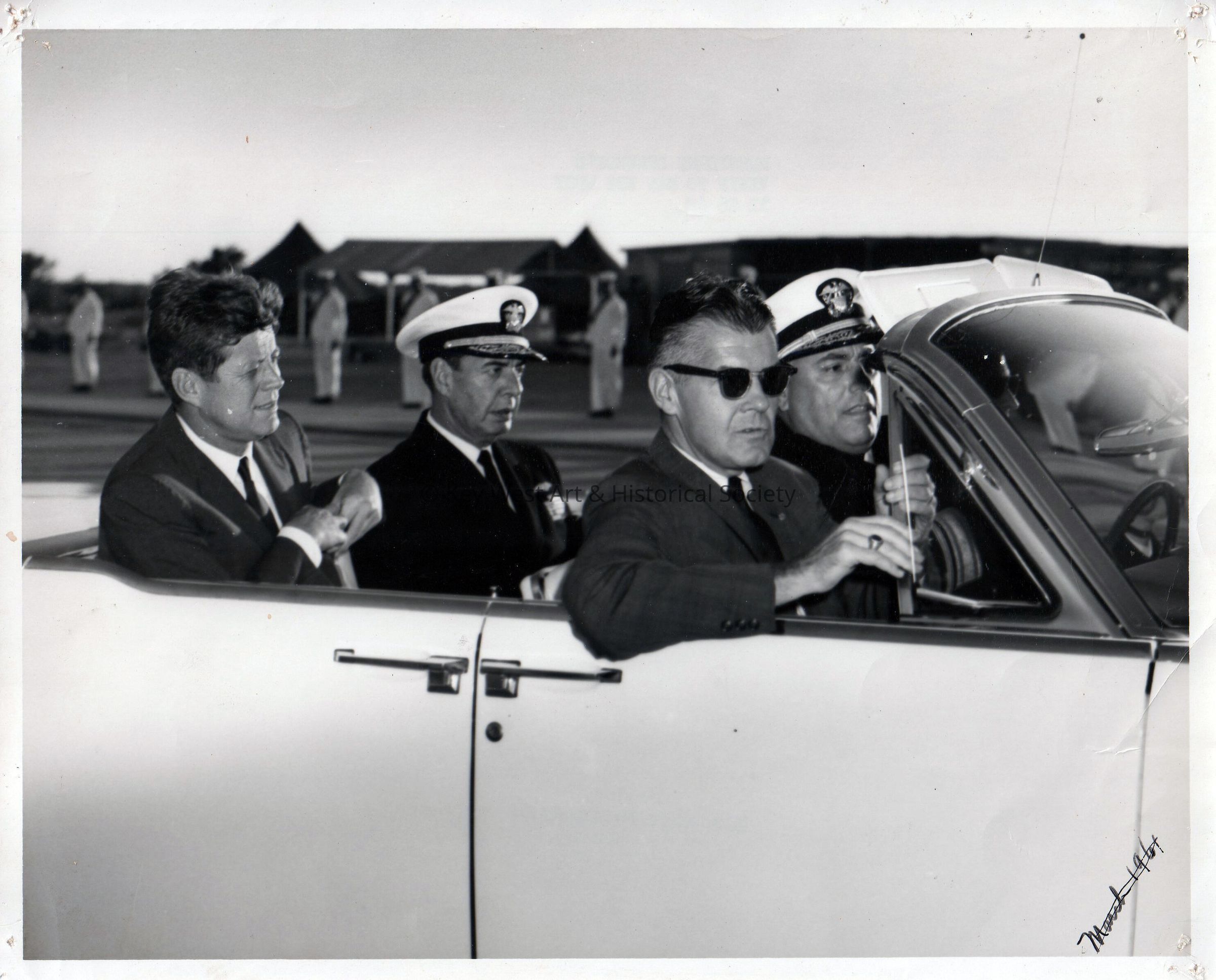 Black and white photograph of U.S. President John F. Kennedy in a car during his visit to Key West. Florida governor Ferris Bryant accompanied President Kennedy and the Joint Chiefs of Staff on a brief trip through Key West to review the military units that participated in the events surrounding the Cuban Missile Crisis.