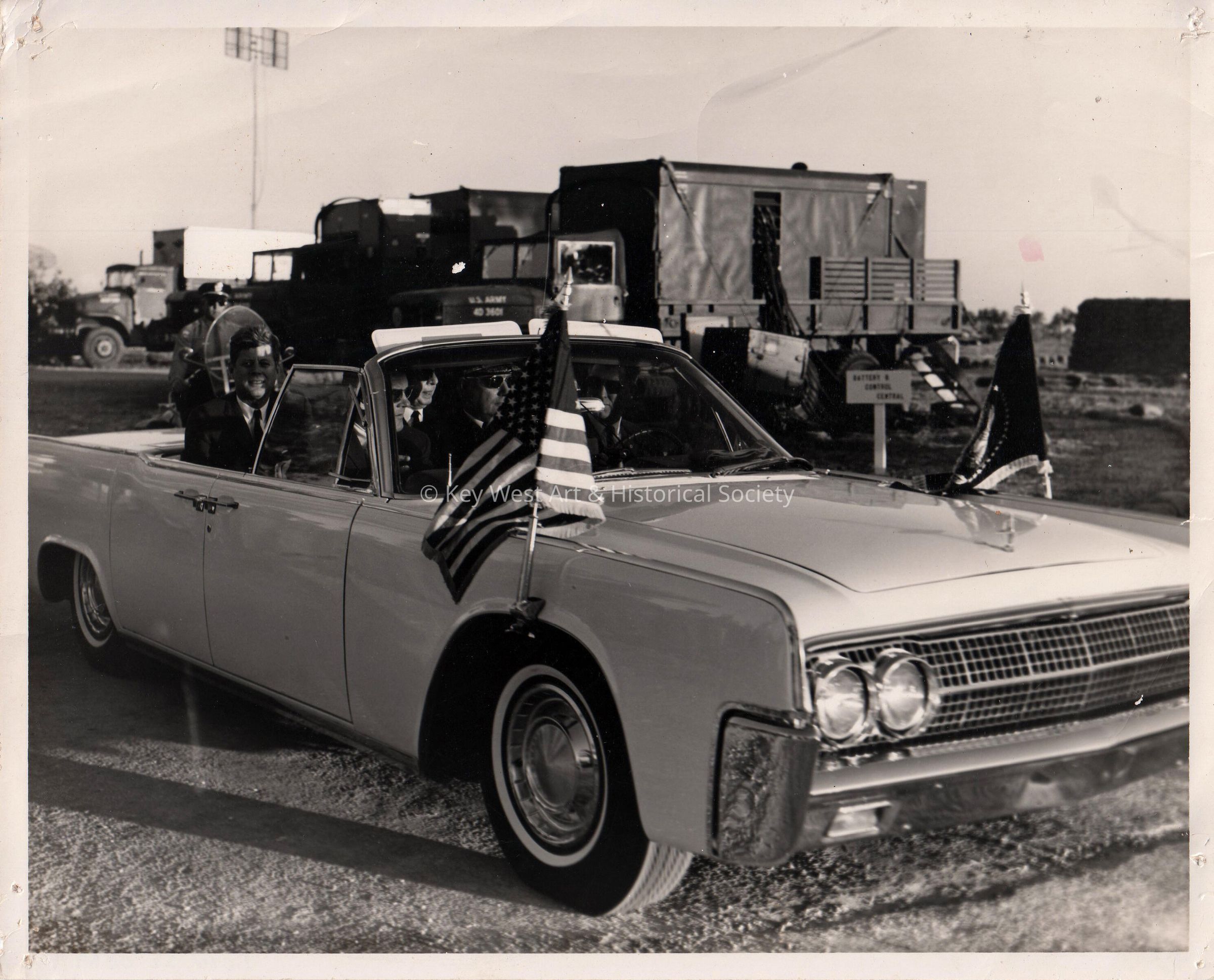 Black and white photograph of U.S. President John F. Kennedy in a car during his visit to Key West. Florida governor Ferris Bryant accompanied President Kennedy and the Joint Chiefs of Staff on a brief trip through Key West to review the military units that participated in the events surrounding the Cuban Missile Crisis.
