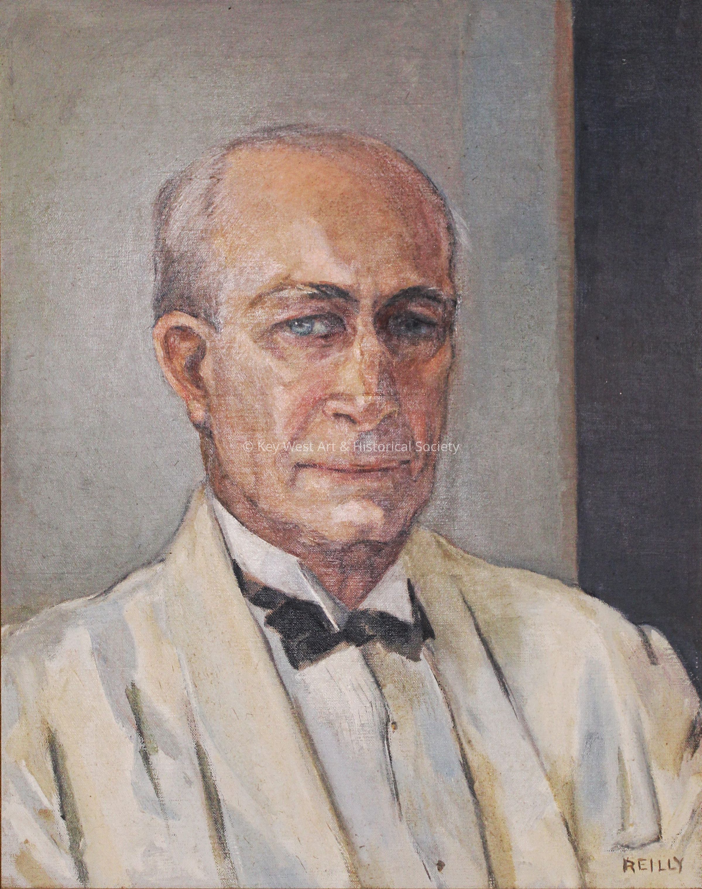 Oil on canvas portrait by Elvira Reilly depicting John Jonathan Jackson. He is depicted from the chest up, facing slightly to his left with a direct, intense gaze towards the viewer. He has balding grey hair and deep-set eyes under prominent brows, which convey a sense of wisdom and experience. He is dressed in a light beige or cream suit with a white shirt and a black bow tie. The background is simple and nondescript, in muted grey tones, focusing attention on the subject.Type of Painting