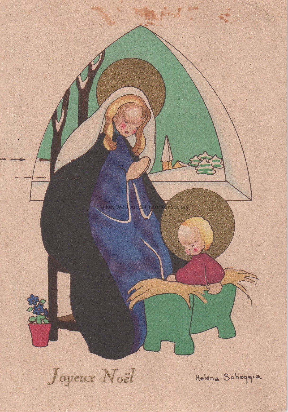 Postcard depicting Mary and Jesus. The caption reads, ‘Joyeux Noel’ (translated from French as Merry Christmas).
