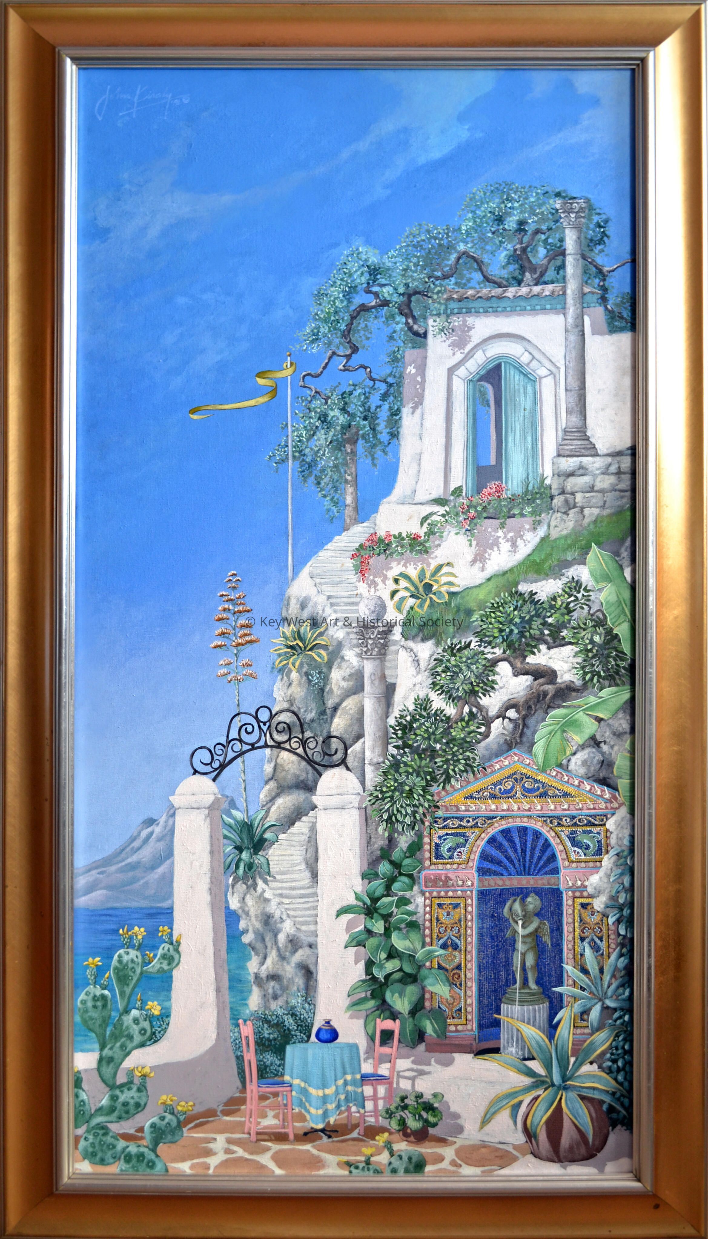 Oil painting on canvas by John Kiraly depicting a building and lengthy staircase on an Amalfi Coast cliff. A small terrace is at the base of the cliff, overlooking the water. The painting was made into a limited edition series of 200 prints.Type of Painting