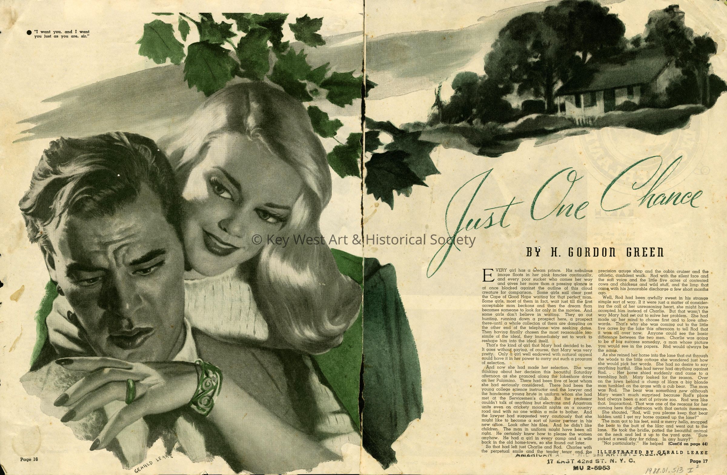 Two page magazine serial story entitled 'Just One Chance' written by H. Gordon Green and illustrated by Gerald Leake.