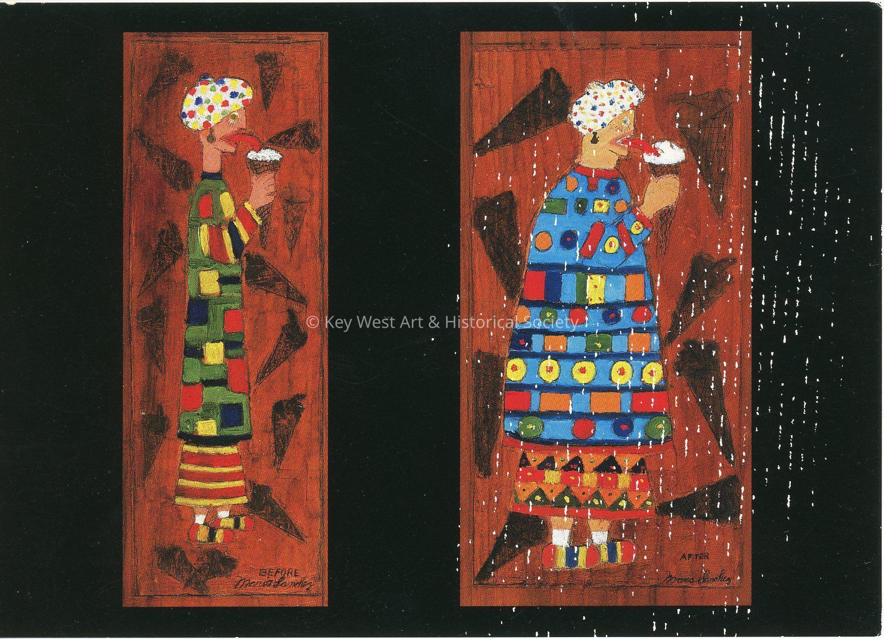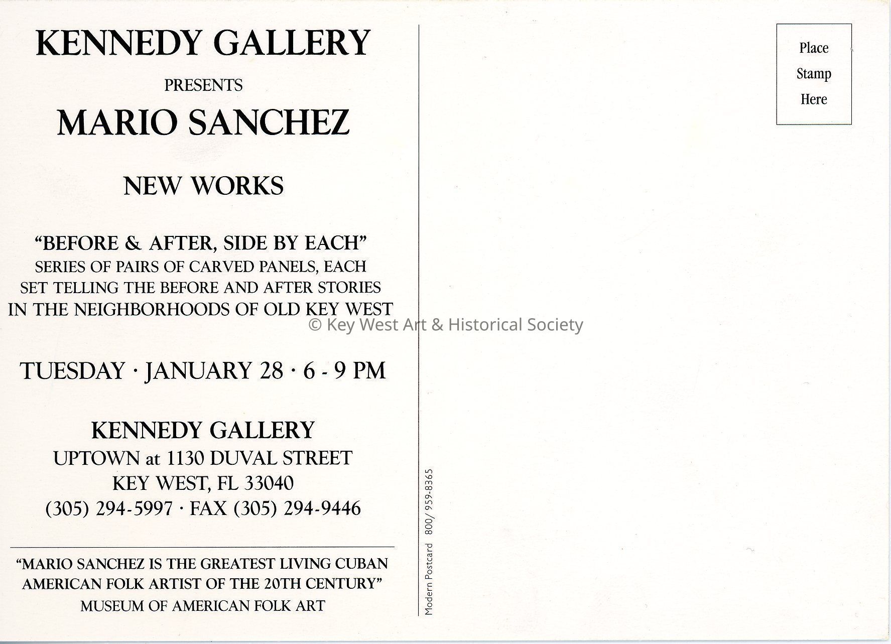 Postcard detailing a Mario Sanchez exhibit hosted by the Kennedy Gallery, formerly located at 1130 Duval Street. The exhibit is described as "Before & After, Side by Each" telling "Before and After Stories" of Key West through paired intaglios.Subject Person/Organization