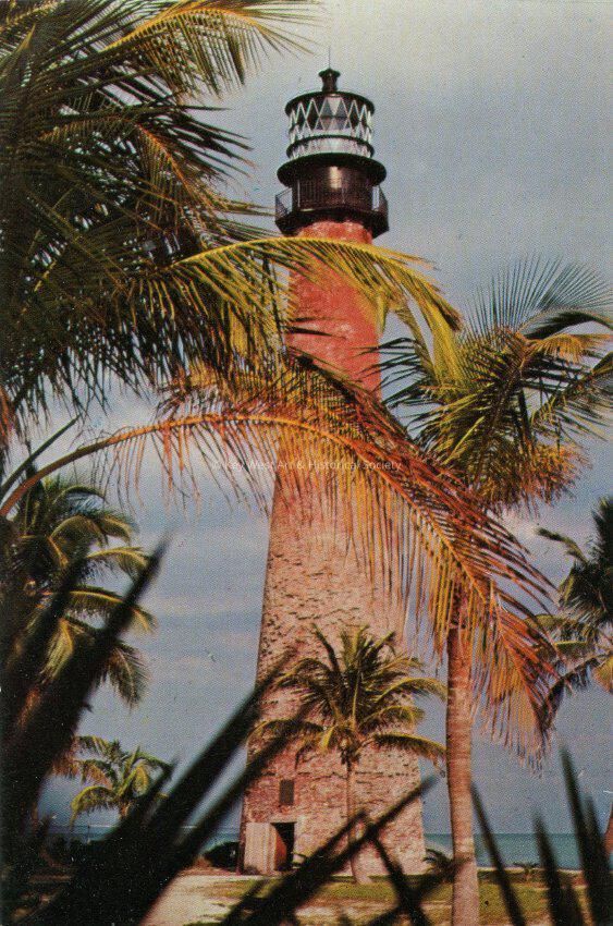 Postcard depicting the Key Biscayne Lighthouse amidst palm trees. The description on the verso reads, ‘Bill Baggs, Cape Florida. Recreation Area, Key Biscayne, Florida. Built in 1825. Rebuilt in 1845 after a fire. The light was built to show the way along the Gulfstream and was lit by flame.’Collection