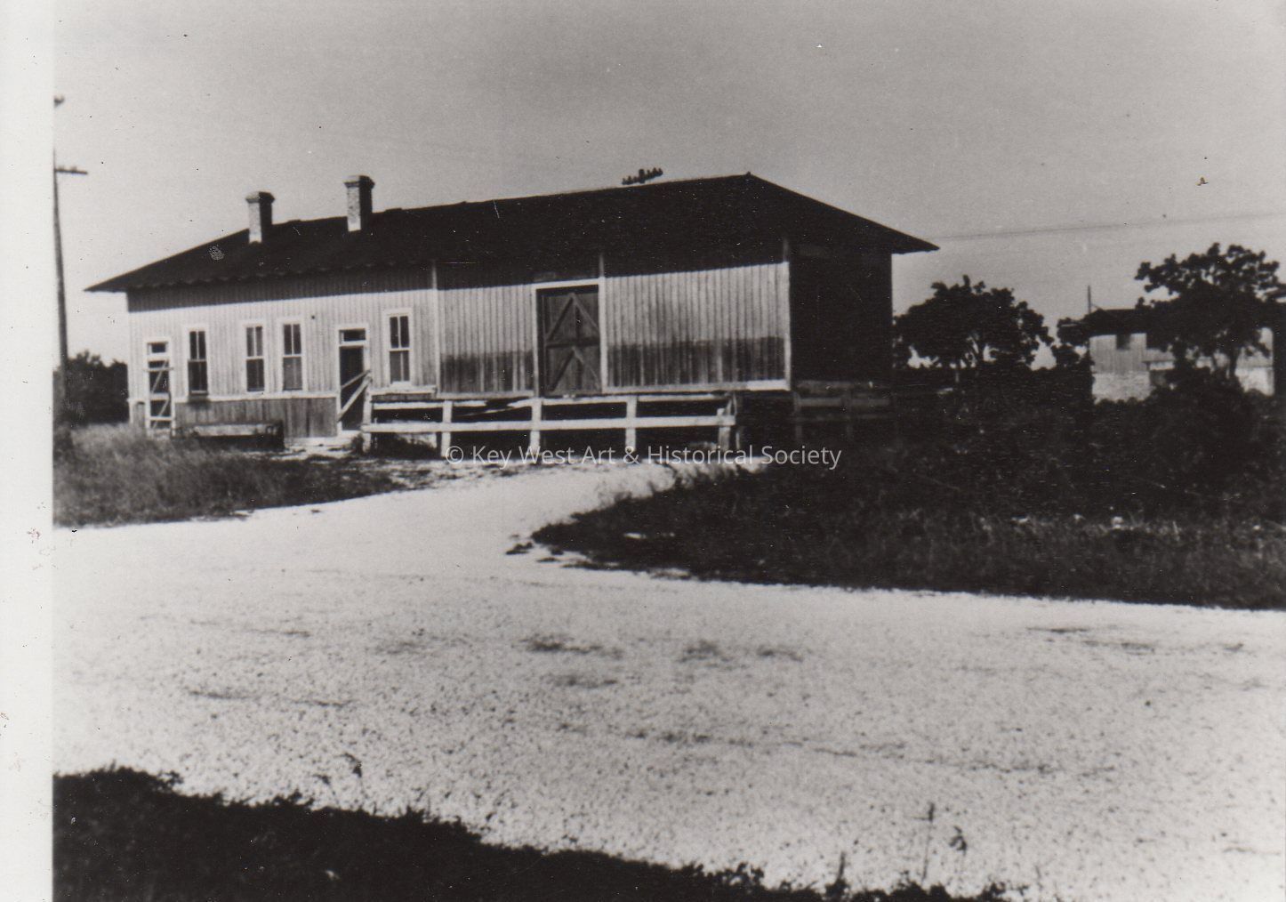 Black and white photograph of the closed Key Largo railroad depot.