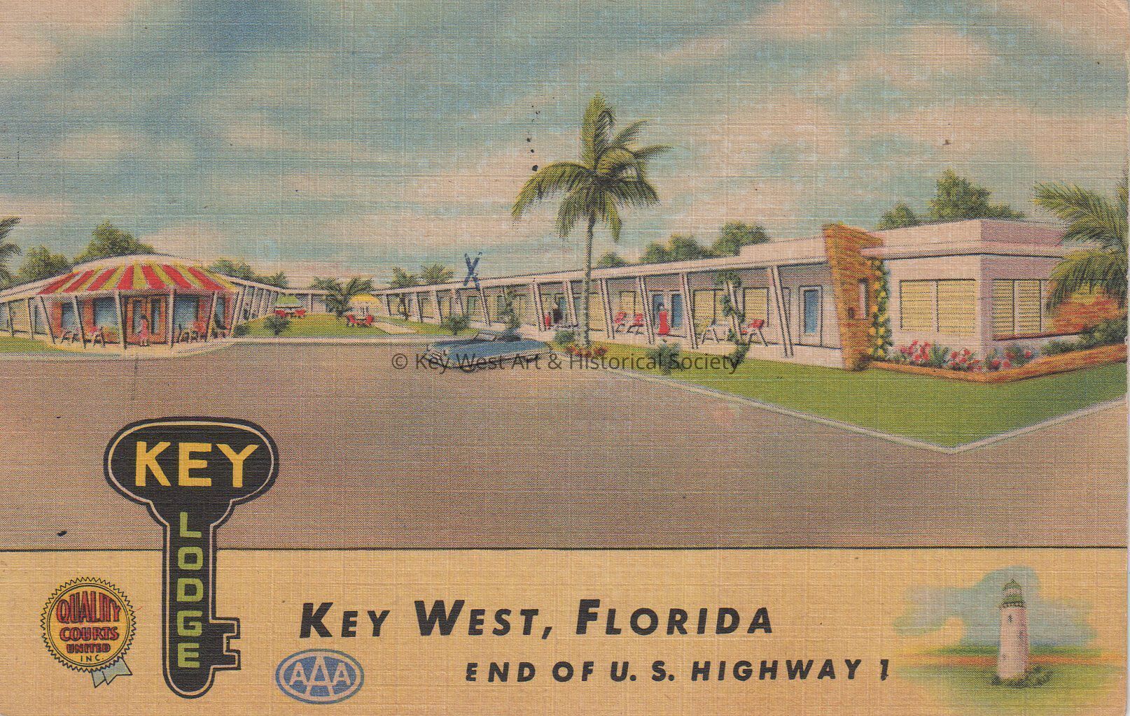 Postcard advertising the Key Lodge Motel at 1004 Duval Street. The caption reads, ‘Key Lodge, Key West, Florida, end of U.S. Highway 1'. The description on the verso reads, 'Key Lodge Motel. Truman and Duval Streets. In the heart of Historic Key West, new, 24 units, heated and air-cooled, glass jalousie windows and doors, running ice water, Terrazzo floors. Tile bathrooms, private parking on premises, shopping district, restaurants, Ocean beach within 3 blocks'.Subject Place