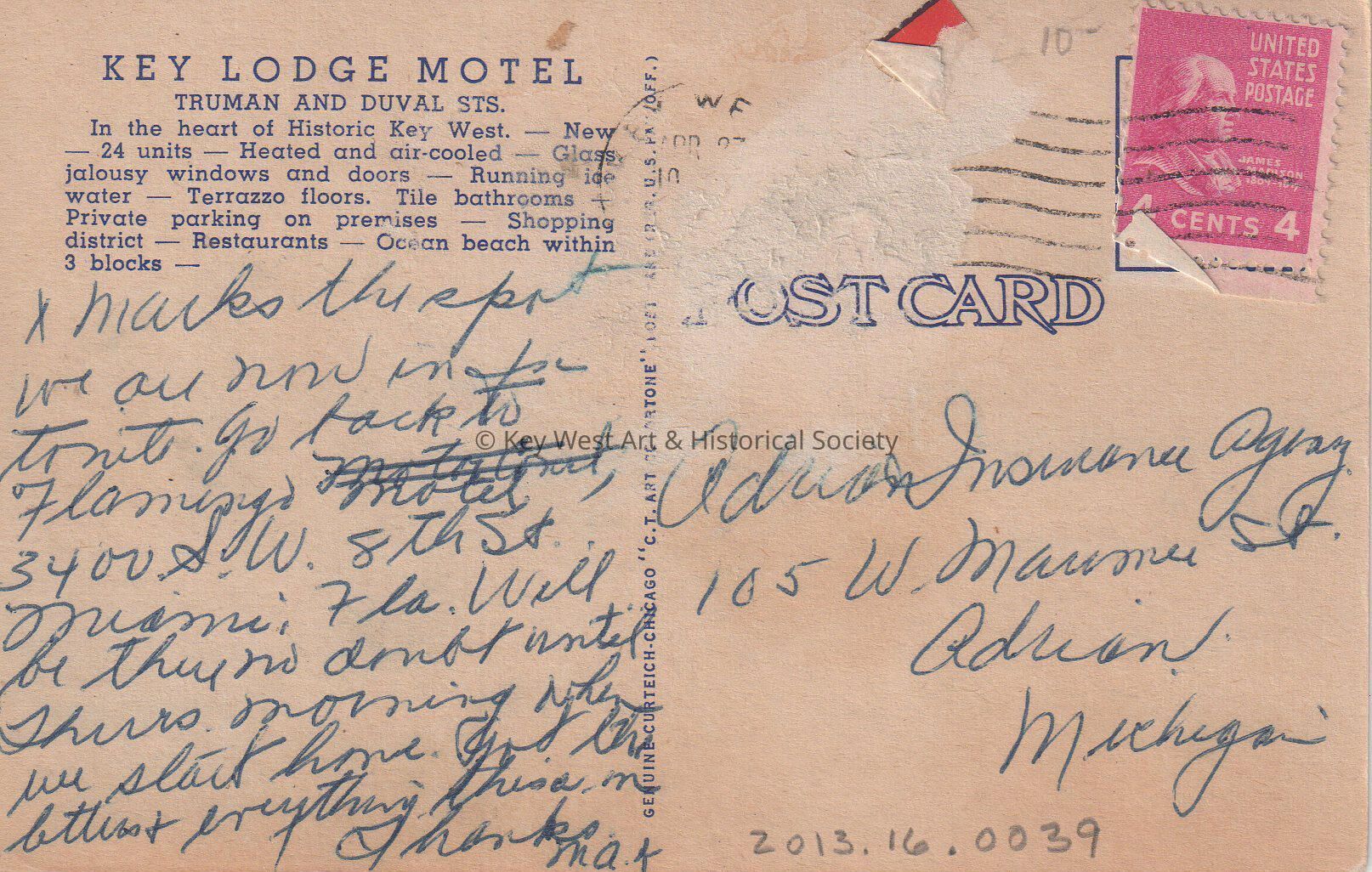 The message on the verso reads, 'X marks the spot we are now in for tonight. Go back to Flamingo Motel, 3400 Southwest 8th Street, Miami, Florida. Will be there no doubt until Thursday morning when we start home. Got the letters and everything this morning. Thanks, Max'. The card is addressed to Adrian Insurance Agency, 105 West Maume, Adrian, Michigan.Language