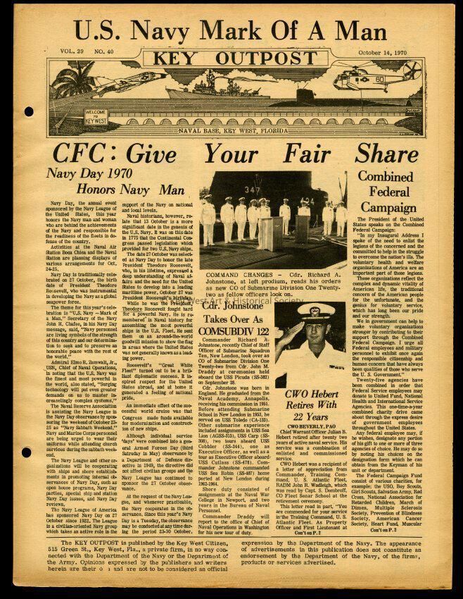 The October 14, 1970 edition of the 'Key Outpost' Newspaper printed by Naval Station Key West as an internal newsletter for military and civilians on base. Volume 28, Number 40. Eight pages.Collection