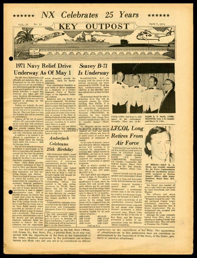 The April 7, 1971 edition of the 'Key Outpost' Newspaper printed by Naval Station Key West as an internal newsletter for military and civilians on base. Volume 30, Number 13. Eight pages.