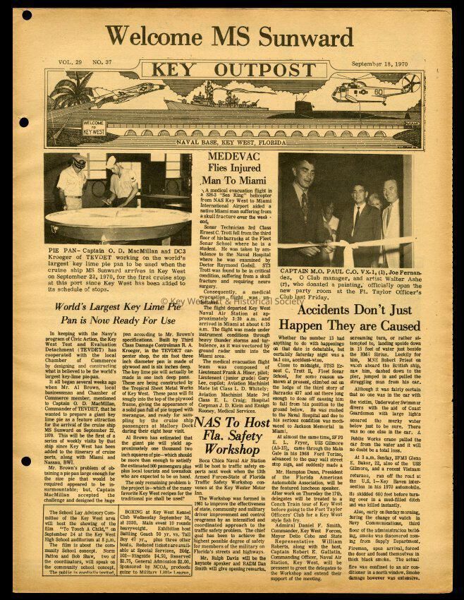 The September 18, 1970 edition of the 'Key Outpost' Newspaper printed by Naval Station Key West as an internal newsletter for military and civilians on base. Volume 28, Number 37. Eight pages.Collection