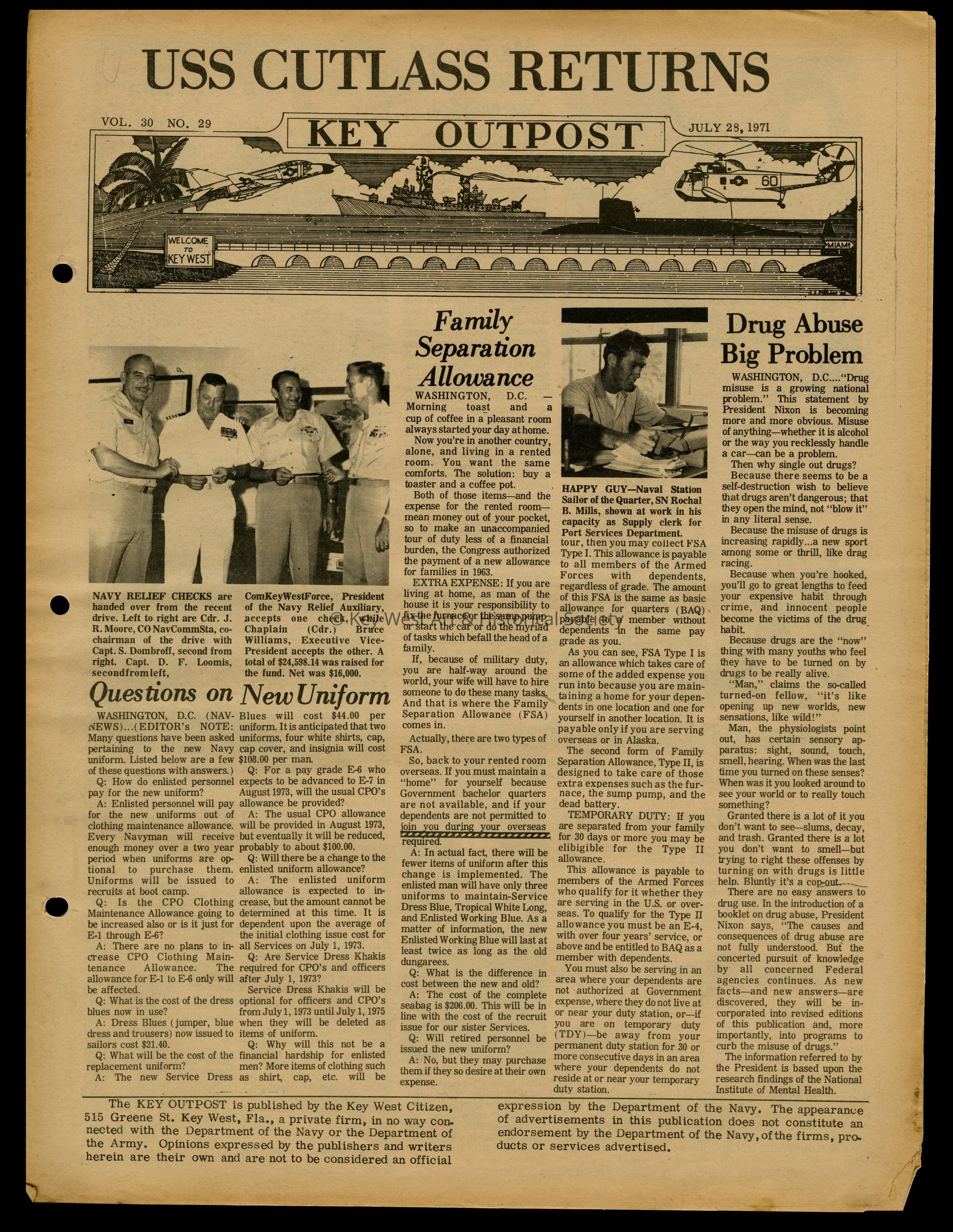 The July 28, 1971 edition of the 'Key Outpost' Newspaper printed by Naval Station Key West as an internal newsletter for military and civilians on base. Volume 30, Number 29. Eight pages.Collection
